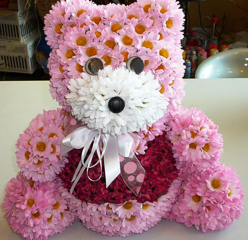 если так хочется медведЯ может из цветов? живьем смотрится очень красиво, из хризантем белых еще краше ИМХО
