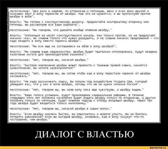 Гы-ы-ы-ыыыыы-ыыы. И это говорит форумчанин, пизицыонирующий себя в качестве тракторозаводской гопоты. Ы-ы-ы-ы-ыыыы "Учили быть вежливым..." ы-ы-ы-ы. ============= Едет наркоман в автобусе, сидит на кресле и балдеет. Hа остановке заходит в автобус дед на костылях, подходит к нему и говорит: - Сынок уступи место, я в 45-ом ногу потерял. - Дед ты гонишь, сколько в 45-ом езжу, а твоей ноги не видел. === Трамвай... Сидит (Д)евочка... лет 15... В это средство передвижения заходит (С)тарушка... Вся такая древняя-древняя... Дунь на нее, она развалится... А наша (Д) сидит прямо у двери... И надо же было такому случиться (С) захотела присесть... Ессно надо попросить девочку встать... (С): Внученька, утупи мне место, я старая стала, ножки у меня болят... совсем старуху не держат.. (Д): Бабуль, а ты пионеркой была? (С): Была, внученька, была.. (Д): И что, когда в трамвае ехала, всем место уступала? (С): Уступала, внученька, уступала... (Д): Так поэтому у тя ноги-то и болят.. . )) === Еще один... Едет панк в метро... Сидит... К нему пробирается дедок... И говорит... (Д): Сынок, встань, пожалуйста.. (П): Э, дед... Знаю я эту фичу... Я встану, а ты сядешь.. === В автобусе пионер и пенсионер. Пенсионер чихает. Пионер: - Будьте здоровы! - Спасибо. - Пожалуйста. - Не стоит. - Ну что Вы... - Не поясничай. - Пошел ты на ***** старый ***идор! ==== ЫЫЫЫЫЫ. Антон. "Бизнес на доверии ведет к большой крови." (в смысле лучше на доверии и на законе) - Борис (незабвенный) Абрамыч.