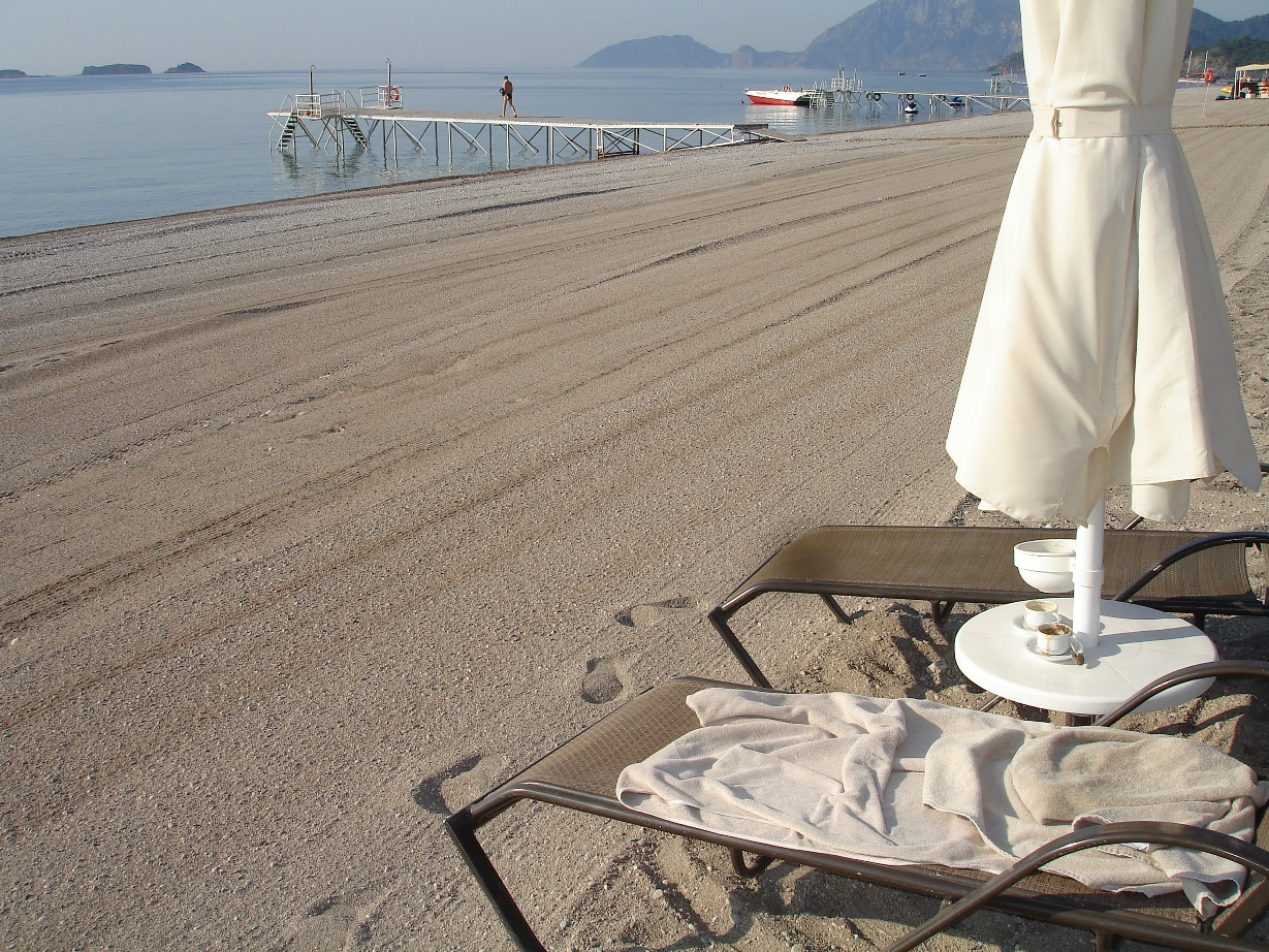 я утром спешл фо ю) утром пляж просто вылизан и приглажен. на последнем фото самый крупный камень, который я нашла специально для Диманюги) а это вид с террассы ресторнана на раннем завтраке такая красота... просто сказка. тахо, спокойно, плеск моря, свежий апельсиновый сок и клубника а где еще её тестить, как не на исторической родине? Шампань и коньяк тоже лучше всего тестить в местах происхождения. В Турции очень неплохое местное вино. терпкое и с насыщенным вкусом. по крайне мере в наших отелях именно этот напиток был представлен в достойном виде во всех 4х случаях. Импортный алкоголь я пробовала в виде коктейлей. Текилу добавляли нормальную в трех случаях из 4х. В Спайсе я попробовала, но пить не решилась. ибо вкус коктейлей, которые заказывали не только я, но и коллеги, был далек от классического. В общем, отели системы Алибей и Гюрал предоставляют своим гостям весьма достойный выбор напитков по системе ультра-всё-включено. За отдельную плату идет только алкоголь от 12 лет выдержки. не совсем так. В момент обращения я еще не была гостем отеля. этим доктор поинтересовался в первую очередь. и после того, как выяснил, что документы еще только на рецепшен, то не стал сильно отвлекаться на меня, хотя и не выпроводил за дверь. В нашей группе в разные дни две девочки повреждали ноги (падения и подворачивания) в этом случае сразу вызывали доктора и очень оперативно оказывали помощь. дня через два они уже снова полноценно были в строю. видимо мне просто попался неудачный момент. а может быть с травмами им более привычно обращаться. голова более сложное - есть опасение сделать что-то не то, и тогда голова будет болеть не у меня, а у доктора. а оно ему надо? тем более формально я еще была не в его зоне ответственности.
