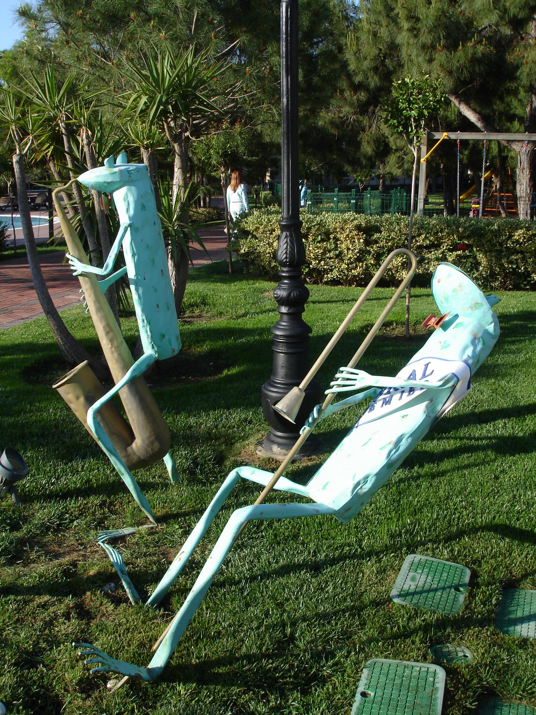 у меня для вас подарки получше. но на всех не хватит, поэтому разыгрывается первый лот - прекрасная пляжная сумка роскошного пятизвездочника! Эти снимки лягушек при входе в отель были сделаны с разницей в один день - раннним утром 1го мая и сегодня утром 3го мая. Снимки 2го мая днем, увы! утерялись. Вопрос: в чем загадочность этих лягушек?