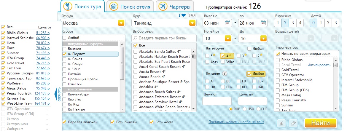 ZoRG, Cоветую обратить внимание на сайт http://sletat.ru/, себе подобрали отдых в Пхукете на 7 ночей, вылет из Москвы (Домодедово) 21 мая, а/к Трансаэро, тур оператор Библио Глобус, ценник 53 500р, Отель Naithonburi Beach Resort 4*