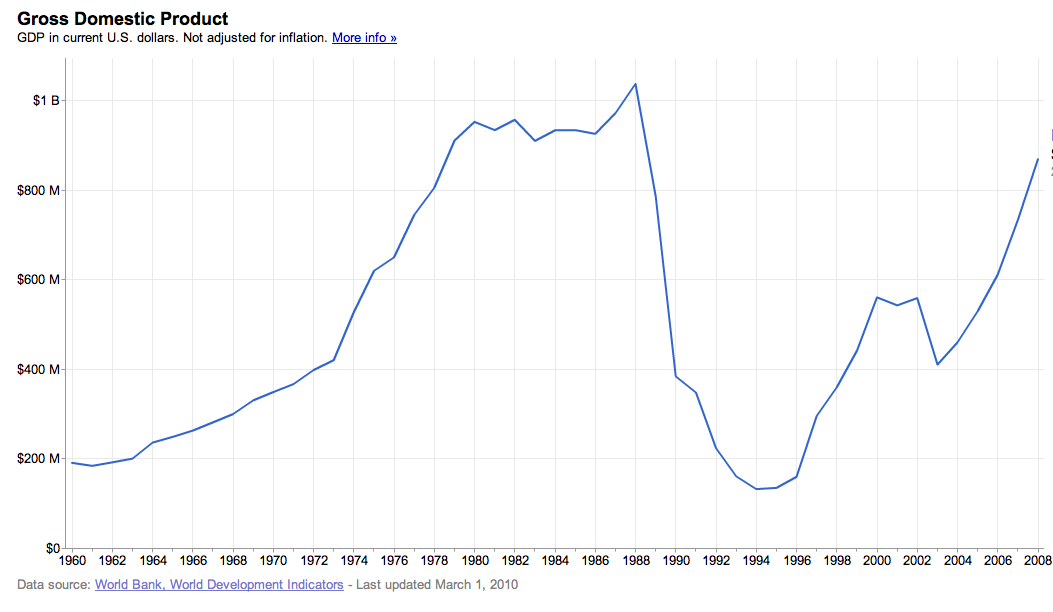 Вот и результат, к чему приводит отказ от западного пути развития и приход к власти человека, обученного и спонсируемого антиамериканской Ливией, основателя патриотического народного фронта Вот ВВП Либерии. Отличнейше видно, в каком году убили последнего президента - "американца" (1980) и в каком к власти пришли товарищи из Ливии (1989). Да, кстати, всех этих уродов в 2005 году из страны вышвырнули, и сейчас в Либерии вполне себе западная демократия и развитие прет полным ходом (тоже хорошо видно на графике), хотя, конечно ливийский период долго будет давать о себе знать.