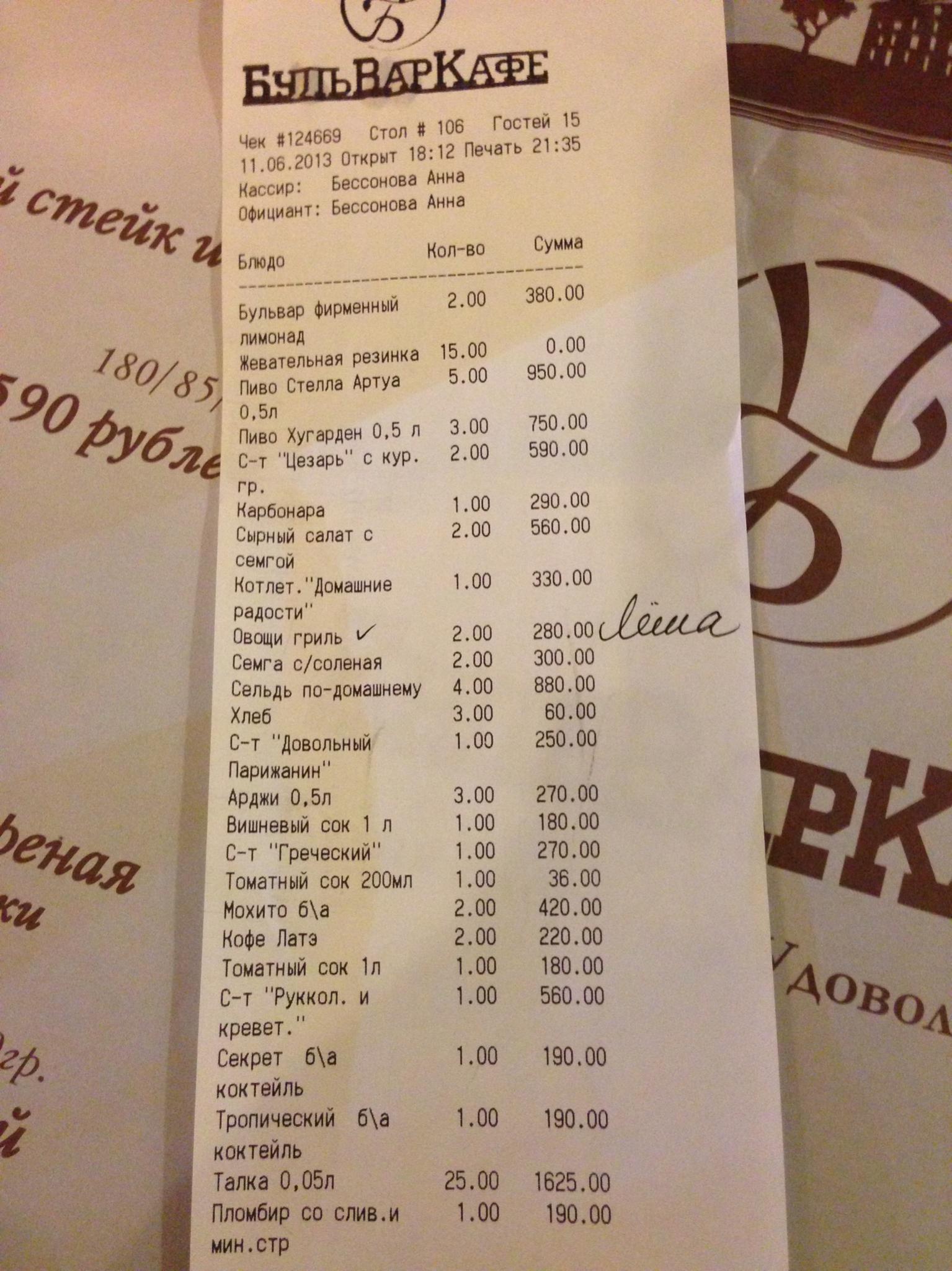 Маришка и каков общий чек на 15 человек? Ценничек там на салатик прям москрвский, как будто на Пятницкой обедали :d