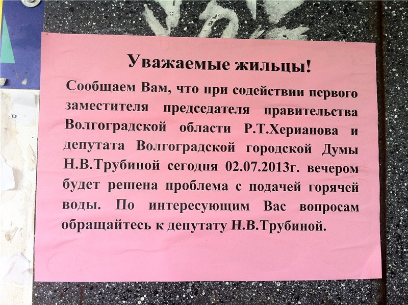 так смешно, да, результат есть, воду дали через 2 недели, как я отправила жалобу в инспекцию. И в это время на подъезде нашего дома повесили вот такое объявление: