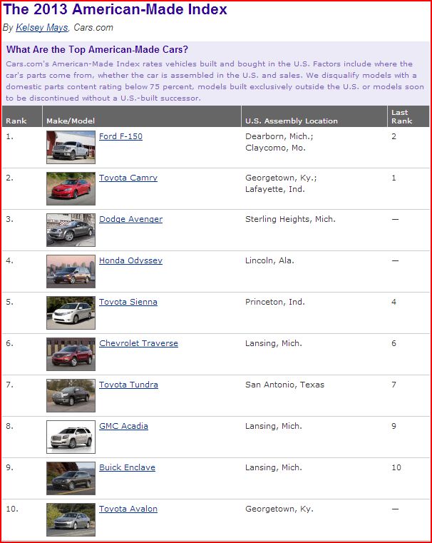 Они ещё забыли рассказать о протекционистских мерах, вынуждающих размещать производство в штатах. Иначе пошлинами задушат. Вот, например, top-10 моделей, сделанных и продаваемых в США: обратите внимание на количество импортных марок (отсюда)