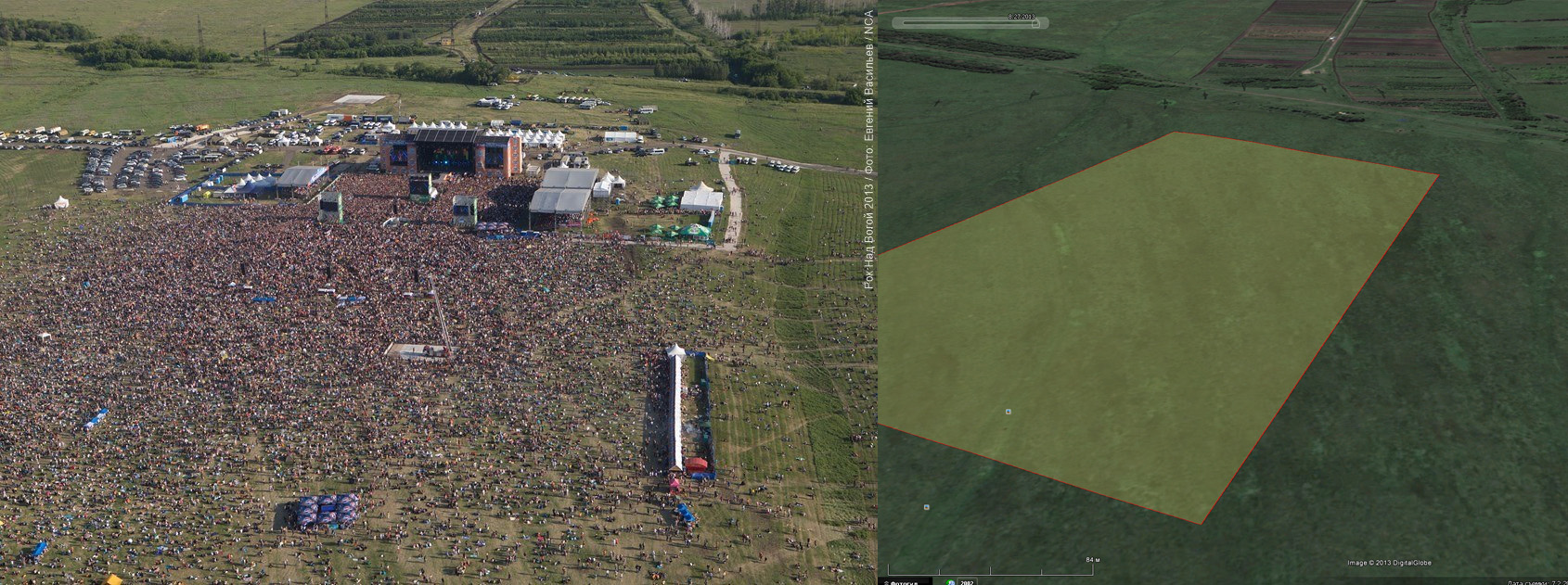 Мда , а Робика раза в 2 преувеличил , на видео видно , что дорога и лес не входят в зону концерта , также от Леска сантиметра 2 убрать нужно , мда , как мы любим чужих приукрасить. И че это за прямоугольник , я может по другому нарисую )). А чейта в Волгограде 2 площадку не выделил , да и 1 сиротливо както ?