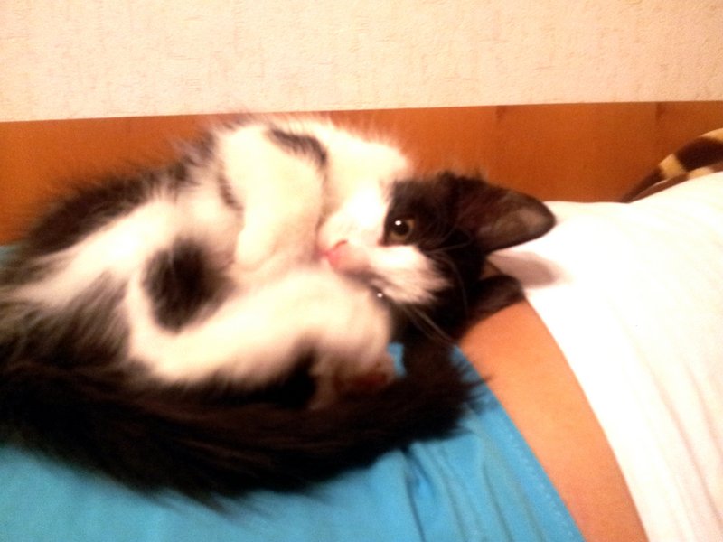 Вчера утром, сев в свою машину, что бы благополучно отправиться на работу услышала непонятный звук -как будто скулит кто или воет, прислушалась- очень жалобно кто то взывал о помощи, вышла из машины, обошла,заглянула под машину - никого, а глухие звуки так и есть, подождав ещё немного вдруг увидела как из днища машины вылез котёнок и жалобно так кричать начал. Видно, что дворовой, но с виду -здоровый, возраст месяца 2,5-3. Жался к ногам, просился прям на руки. Взяла его домой на первое время, очень жалко было оставлять на улице, худенький он, как взяла на руки -дрожал, но стал громко мурчать. Дома накупали, накормили, выяснилось что это молодая кошечка, просто чудесная - харизматичная, очень ласковая, требующая к себе внимания, очень активная и не капли не стеснительная. . Страшно подумать, что могло быть с малышкой, если бы я не услышала её мяуканья и просто поехала бы на работу... Себе это чудо оставить не могу -живёт кролик, с которым она кстати уже успела подружиться, и в скором времени переедет собака. Кстати, кошечка очень умная -стоило 2 раза мне посадить её в лоточек с места где она решила оправиться, как смотрю она уже утром там шкребёт вовсю и делает своё мокрое дело!Передержать смогу максимум неделю, потом в командировку. Девочка будет замечательным ласковым животным в любящих руках!