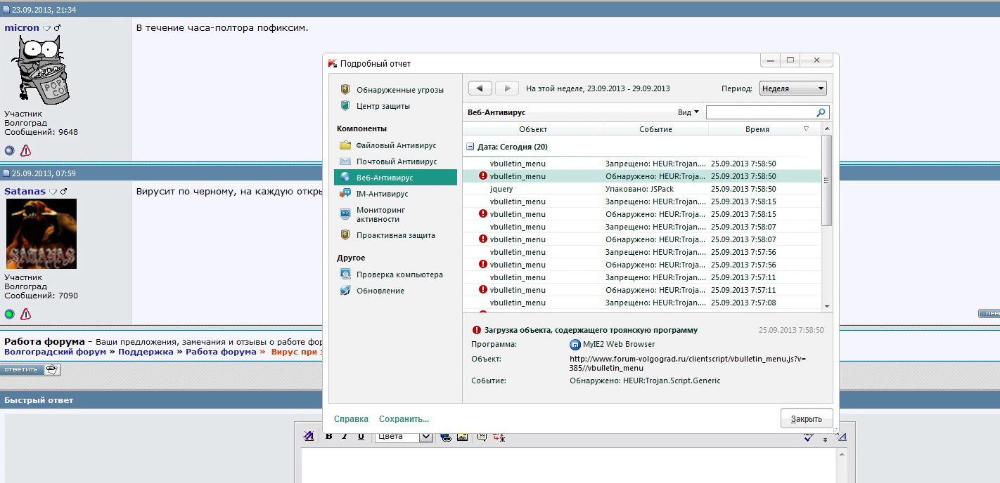 Все чисто, и Касперский молчит. Большая просьба! Чтобы понять, действительно ли это проблема на форуме, или у пользователя, при появлении сообщения о вирусе, сохранить полностью страницу, на которой вы сейчас находитесь. Для этого в браузере нажать ctrl + s. Заархивировать сохраненный каталог + сам HTML файл, и выслать архив на адрес форума: mail@forum-volgograd.ru .