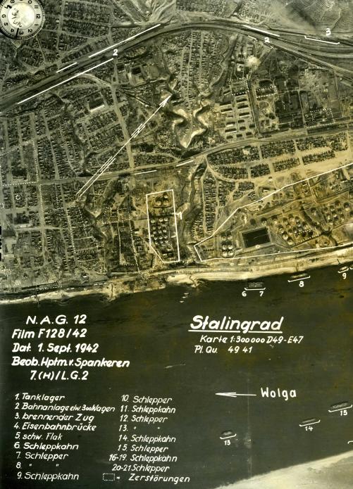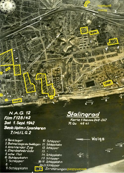 Невозможно делать столь далеко идущие выводы на основе одной фотографии одного маленького фрагментика берега. Вы в курсе, что баки стояли практически по всему берегу, т.к. там стояли предприятия (тракторный, баррикады)? См. фото только окрестностей "теннисной ракетки". Специально обвёл квадратом то, что у вас на фотке. Это менее половины всех баков в районе "лазури". Может все эти баки как раз таки уничтожены или горят? Там этих баков на всех хватило бы и на Чуйкова осталось ещё.. Так что у вас шаткие основания для заявлений. Слуш-те, вы что на полном серьёзе отрицаете массированные действия немцев по Сталинграду в конце августа? Не советую..) Конечно, 2000 самолётовылетов в день - это преувеличение. 8 воздушной армией 23.08.1942 зафиксировано ок. 1500 вылетов по порядкам и тылам 62, 64 армий и Сталинграду. Из них собственно по Сталинграду - 400-500 вылетов. В последующие дни количество самолётопроётов последовательно уменьшалось 24.08 - 1200, 25.08 - 1000. Т.е., если пропорция сохраняется, то за 23-27.08 как раз и наберётся около 2000 самолётовылетов непосредственно по Сталинграду. А это, извините, тоже немало. Это свыше 1000 тонн бомб