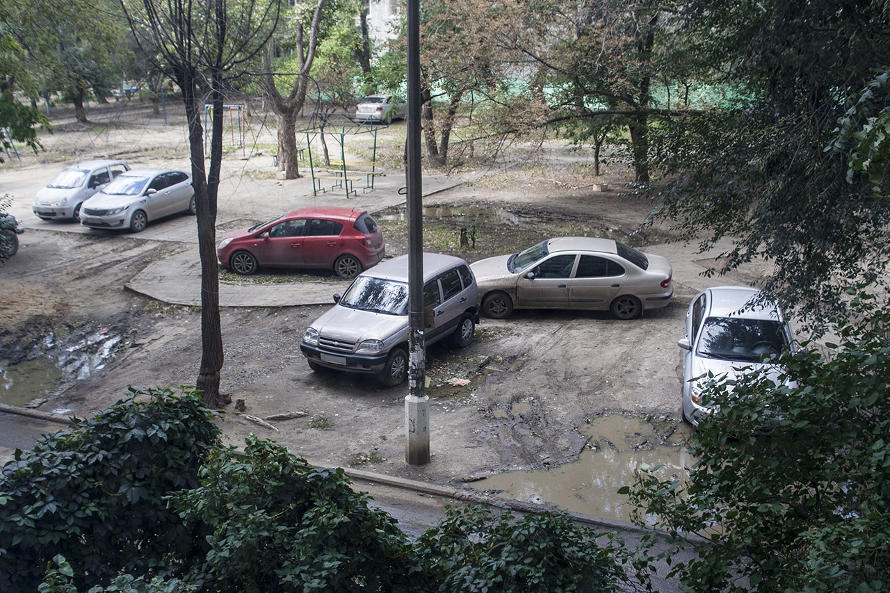 Угу. Типичный волгоградский двор. Машины натыканы прямо на те узкие дорожки, которые могли бы позволить ходить по двору с колясками или просто гулять не измазавшись по уши в грязи.