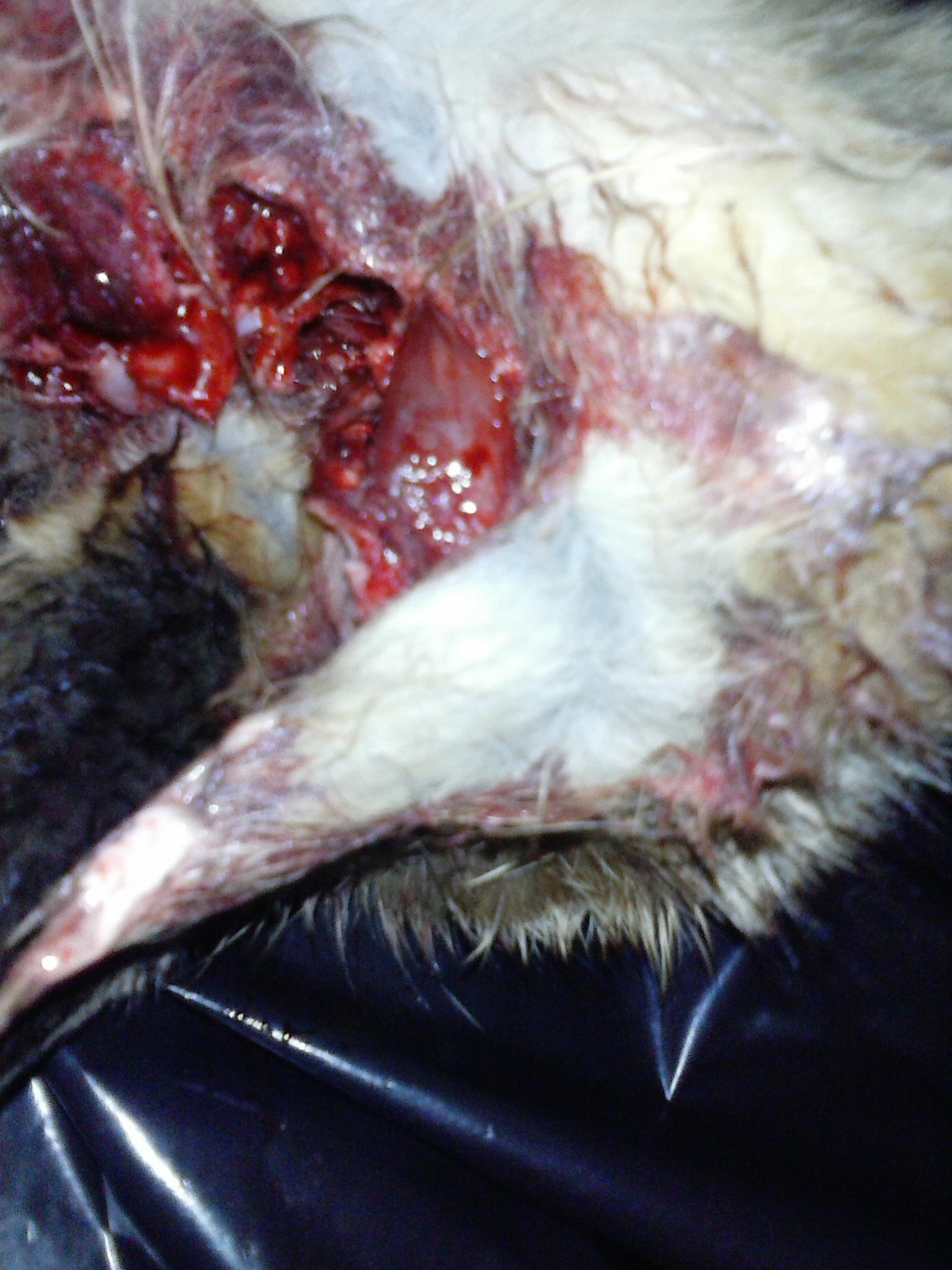 И вот что у неё осталось вместо задней части головы, причем пуля была, далеко не самого экспансивного действия и попадание было очень четким, аккурат между глазами. Дистанция 120-130м. А еслиб не так четко в голову попасть, а к примеру куда нибудь по телу с зацепом крупных костей и(или) позвоночника, то разорвало бы ету лису в дребезги.