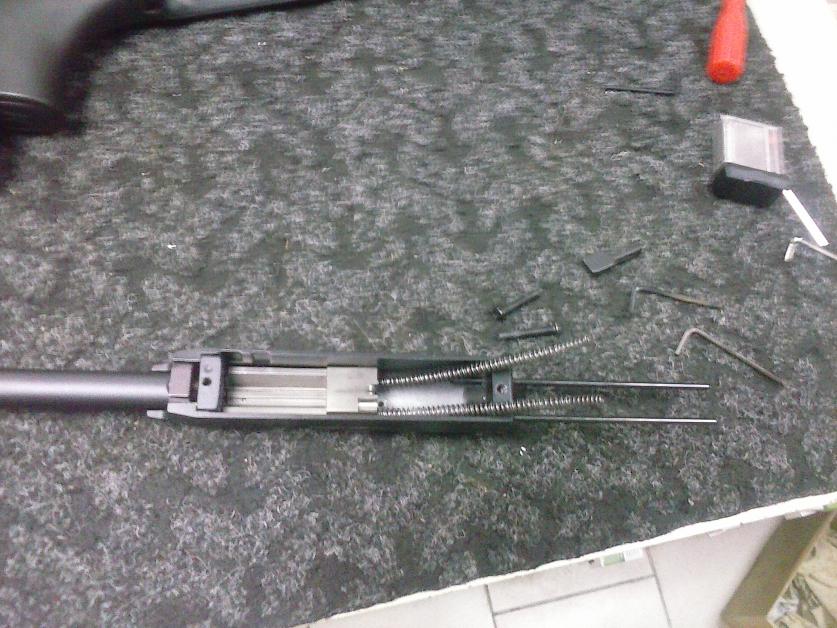 кароче не обломался пошел свою разобрал до болтиков, сейчас в нескольких постах с фотками покажу, как 597ой изнутри выглядит. фото 1: коробка со стволом и открученной ложей фото 2: Затворная коробка(вид сверху) с прикрученным родным вивером фото 3 и 4: Те самые болтики(заглушки), на стволе, в местах установки снятых механических прицельных приспособлений, которые до этого стояли там- куда сейчас прикручен вивер фото 5: Шпилька, на которой держится усм на коробке(которую я поменял)