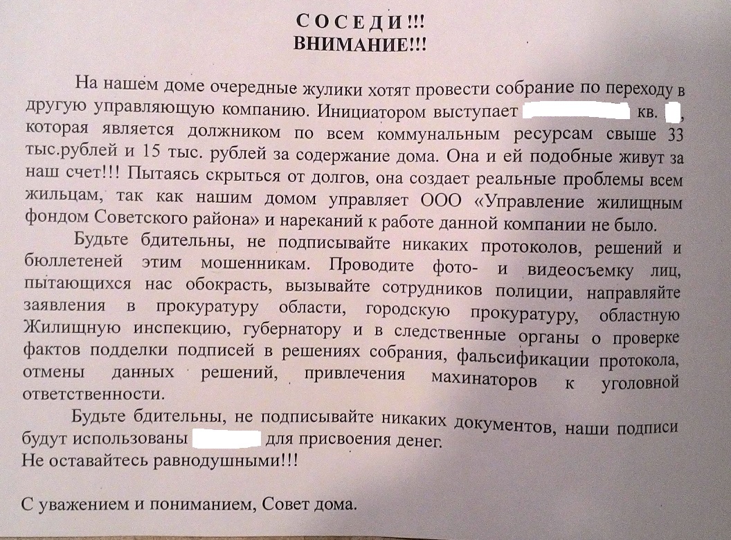 А у нас новый сезон борьбы с бандой УЖФСР. В среду повесили объявление о проведении ОСС по поводу перехода к другой УК. Но банда не хочет расставаться с нашим "убыточным" домом и вчера в почтовом ящике обнаружил прекрасное: И это при том, что никакого совета дома у нас нет и сама УЖФСР пришла в дом через подделку документов. Вот думаю, есть ли смысл засылать эту картинку куда-нибудь в ГЖИ?