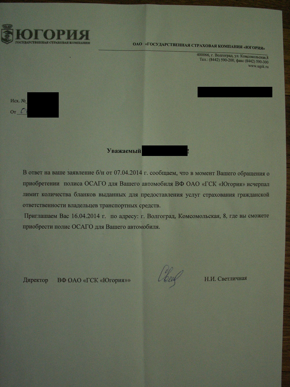 Пришёл ответ от Югории. Надо ли говорить, что придя сегодня в 9:05 мне заявили, что бланки "уже" кончились. Связной, даже имея на руках подтверждённый их колл-центром расчёт, отказывается продавать полис по закону (хотя бланки есть), только с 3700р сверху (я даже не стал спрашивать за что именно).