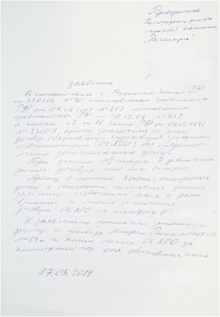 КАК ЗАСТРАХОВАТЬ ОСАГО БЕЗ ДОП.УСЛУГ (личный опыт) Как застраховать ОСАГО без доп.услуг (личный опыт) Я поступил по инструкции которую давал Роспотребнадзор: "Как заставить страховщика заключить договор ОСАГО без дополнительных услуг". 1. Написал заявление в свободной форме на руководителя СК с указанием нормативных актов, по которым они меня обязаны застраховать (см. в аттаче). 2. Приложил заполненное заявление на ОСАГО по утвержденной форме. Класс "безубыточности" (коэфициеент бонус-малус) можно посмотреть по базе РСА. 3. Отправил заказным письмом с уведомлением на оффициальные адреса СК. Я писал на Росгосстрах (400075, г. Волгоград, ул. Историческая, 122) и ЗАО "МАКС" (400005,г. Волгоград, ул. им. Маршала Чуйкова, д.55). Через 10 дней после отправки писем мне позвонили из МАКСа и сказали что можно приехать застраховаться в ближайшее удобное время. Подъехал, подождал 1 человека который там что-то оформлял и спокойно застраховался. От РГС вестей не было. Пока меня оформляли регулярно звонил телефон и менеджер всем прискорбно сообщал что бланки вот буквально вчера закончились и может быть будут на следующей неделе.