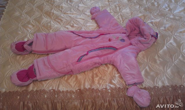 Для девочки. Размер: 62-68 см (2-6 мес) На рост 68 см. В комплекте мягкие ботиночки и варежки. Наполнитель - холлофайбер. Не использовался. тел. 8-917-839-91-62.