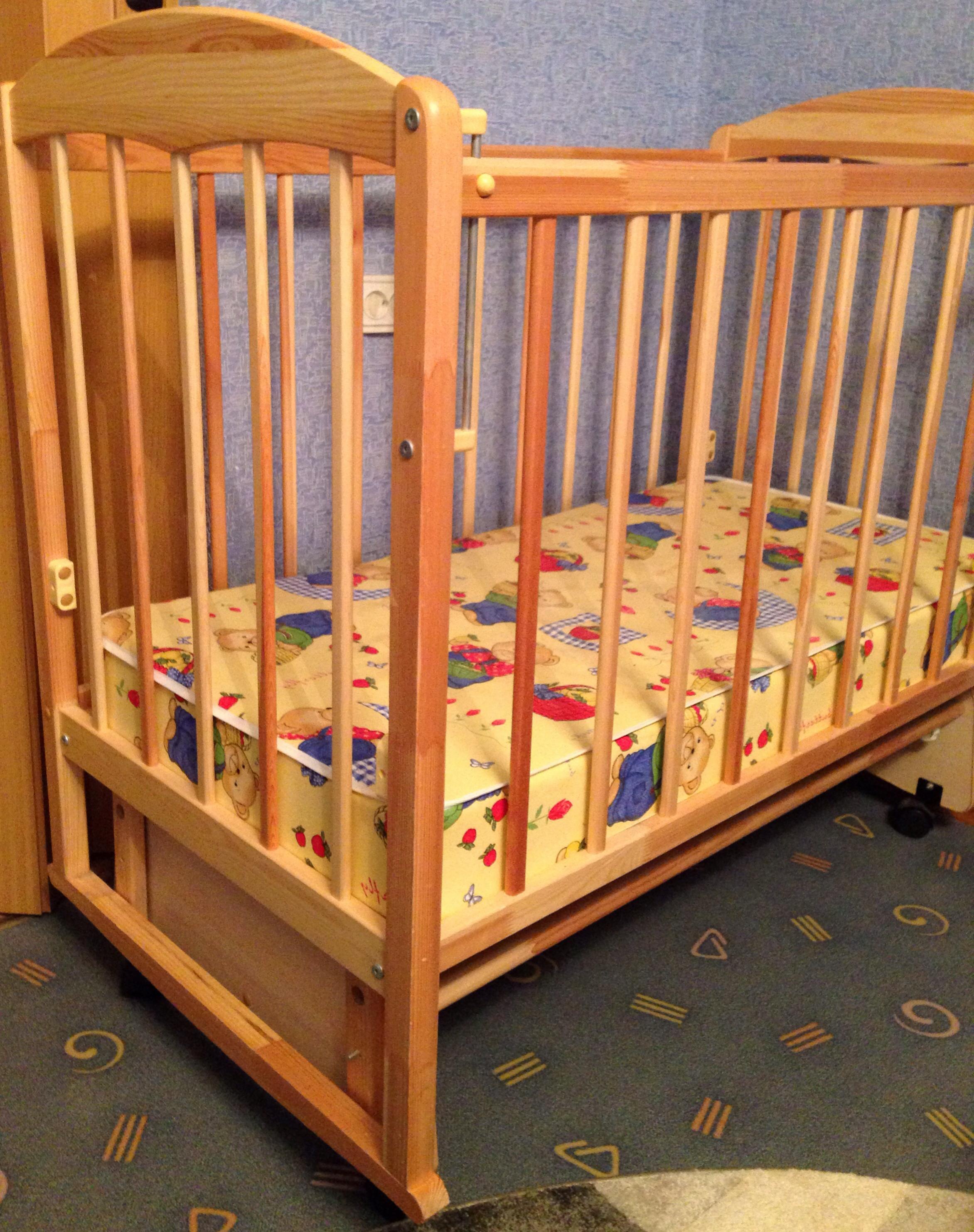 Дерево, продольный маятник на подшипниках, колесики, регулировка дна в двух положениях, матрас ортопедический с бортиками, состояние отличное. 3000 руб.