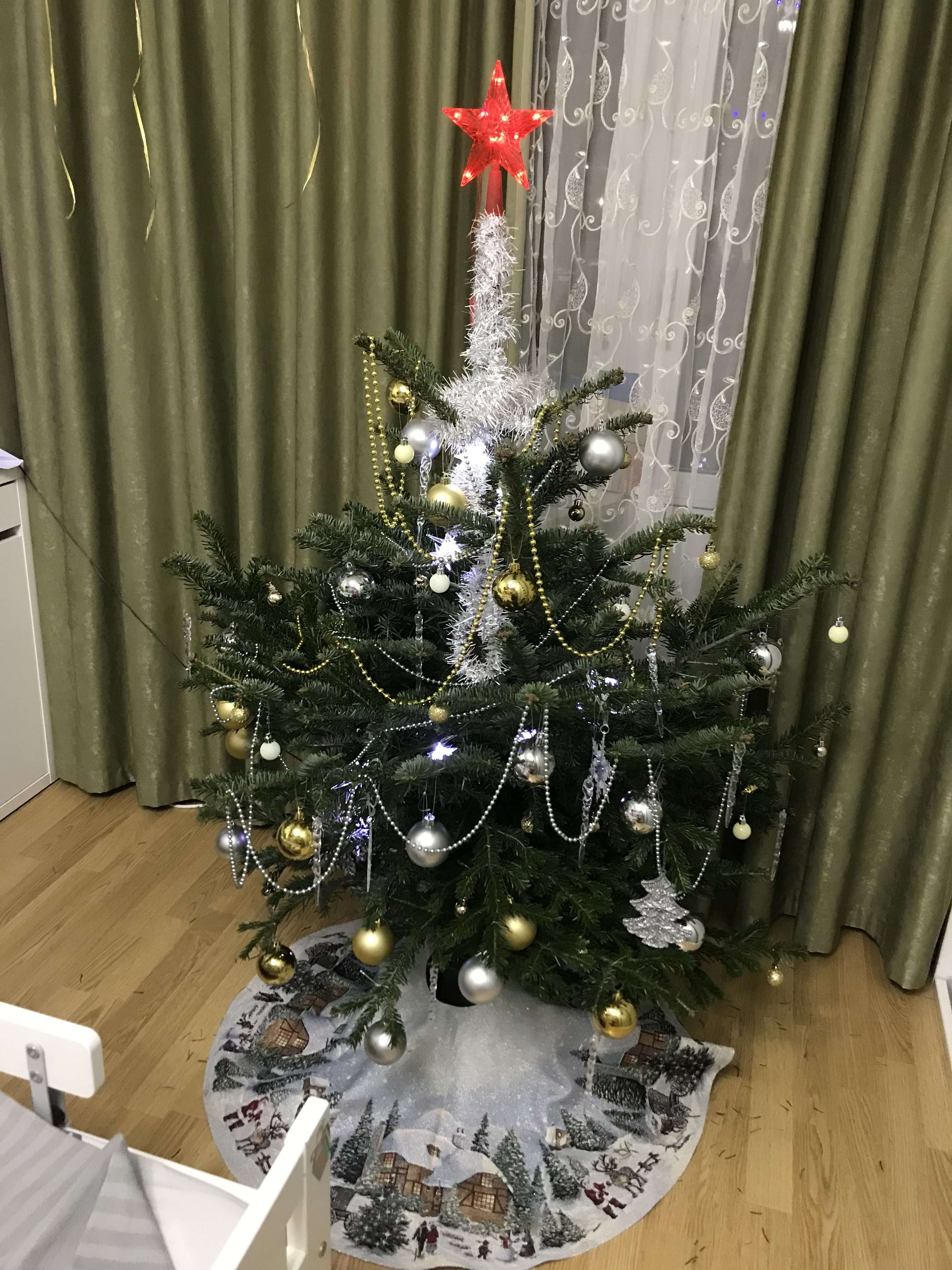 Наряжали дети. Дочь попросила игрушки в белом и серебряном цвете.