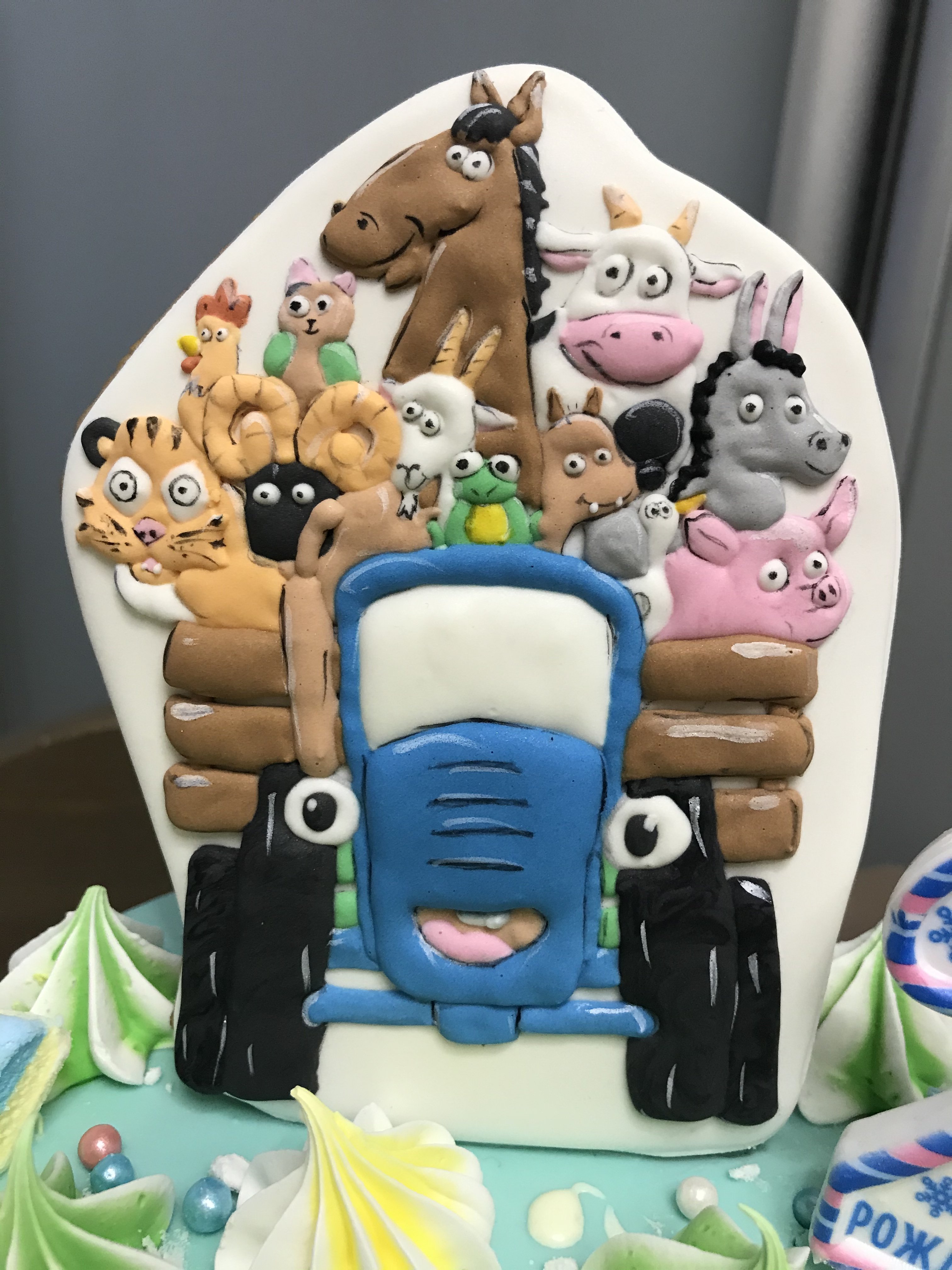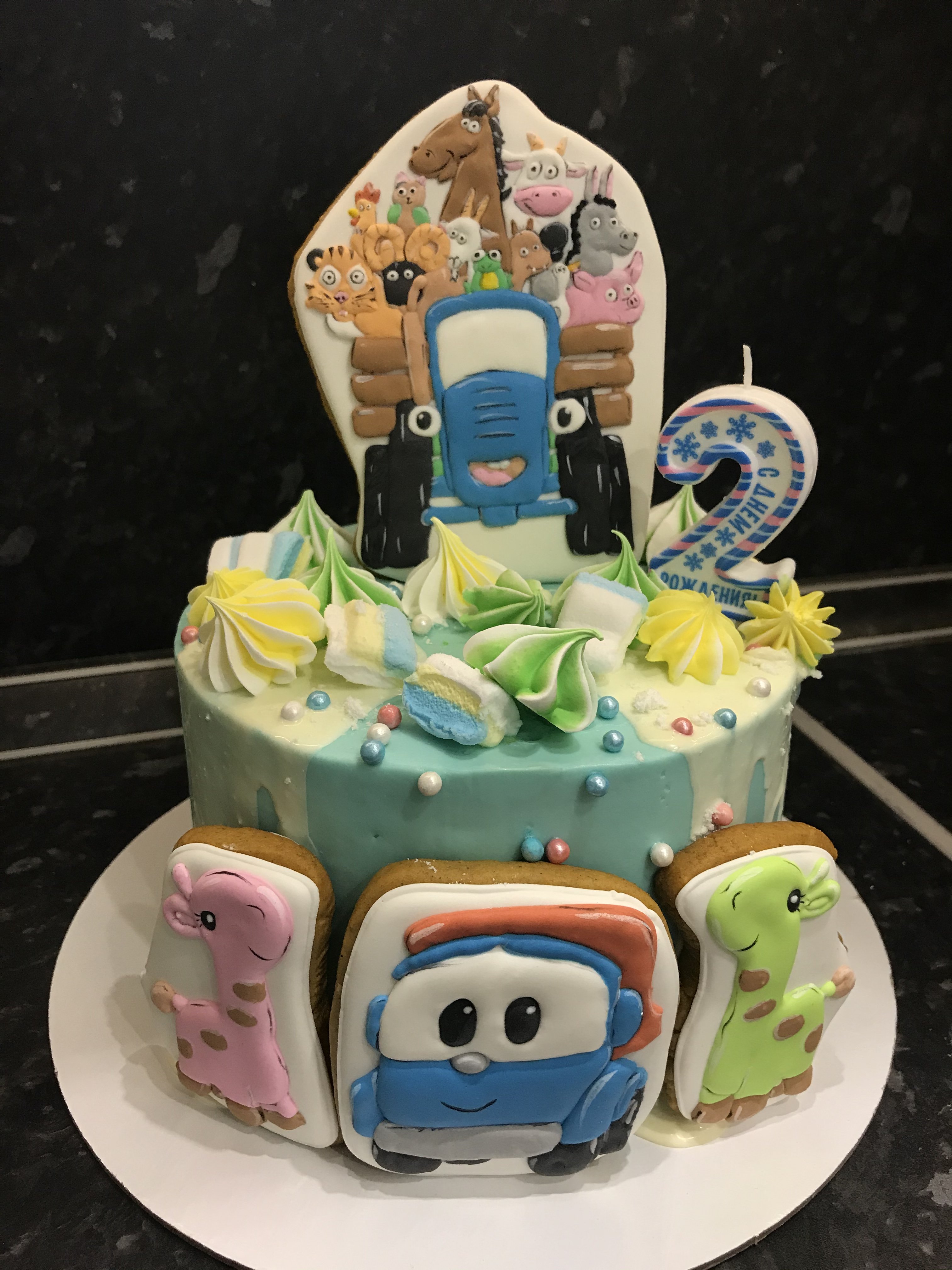 Ну что, сыну два года. Сплю я чуть лучше А вообще, зашла торт показать! Не могу не показать) Он не только красивый, но и вкусный! Клубничный милкшейк. Любимый мультик сына Синий трактор, который мы смотрели почти два года Сейчас перешёл на Лева грузовичок. И два жирафа) Дети одного делили перед сном, красного (он изначально был подарен Даше). Купили Диме, зелёного. Даша теперь ждёт розового, чтоб такой же большой как зелёный Вот потому на торт попали и жирафы) Не моих рук дело))