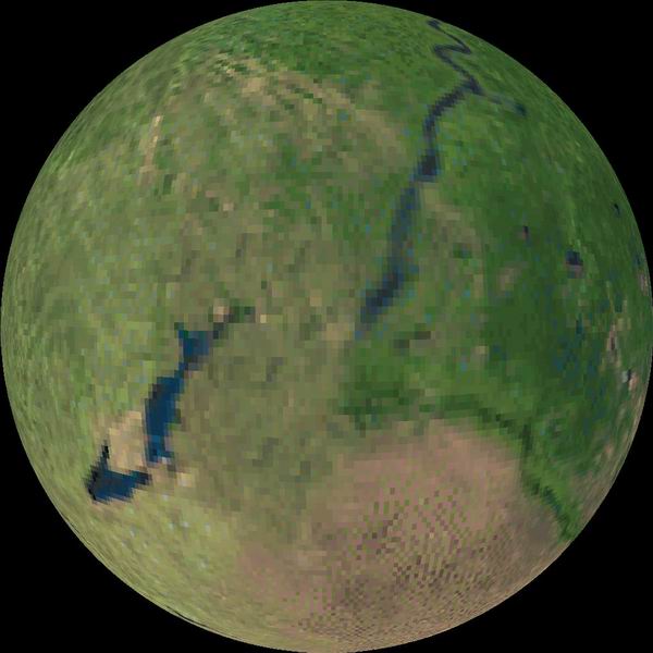 То, что выложил Пиводуй, это скриншот из одной заставки, где можно "смотреть" на Землю в реальном времени с луны, с солнца, с определенной высоты над заданной координатой... Вот когда ставишь величину примерно 50 км, такая лажа и получается. Есть черно-белый снимок Волгограда (северная часть, где можно рассмотреть дома. Весит 740 Кб, разрешение 2400х3400 пикс.