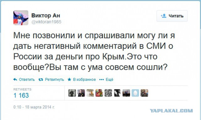 И еще - проблемы общества сейчас везде, подходит очередной кризис капитализма, как не пытаются его отсрочить. Замута с Крымом - очень удобный повод слегка размежеваться с Западом, чуток закрыться от него, причем их же собственными руками. Санкции Запада для России будут полезны, имхо. В общем нормальная политика - одно действие преследует несколько целей, как краткосрочных, так и долгосрочных. Территория увеличилась, население увеличилось, аренду за флот платить не надо, встречными санкциями можно "обрубить" невыгодные и кабальные условия прошлых договоренностей, внутренний рейтинг власти растет, население воодушевлено, геополитические противники в замешательстве и обалдевают от дерзости.