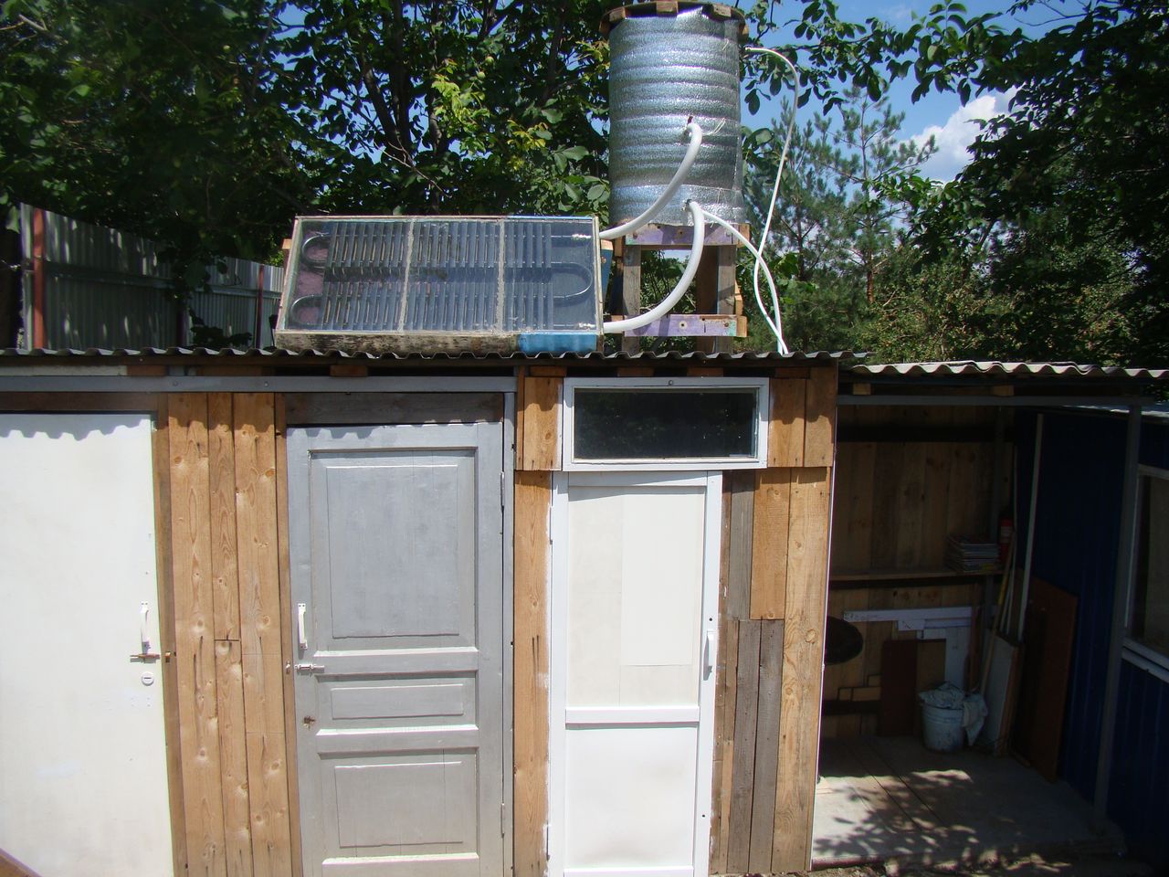 Солнечный коллектор рулит. Из ощутимых плюсов - не нужна электроэнергия и соответственно отсутствуют денежные затраты за подогрев. Из минусов - необходимо поработать руками и головой. Прошлогоднее фото моей самодеятельности ниже. Денежные затраты около 1 тысячи рублей (емкость уже была). Все основные компоненты можно купить б/у на Птичке задешево. Купался в душе в прошлом году до конца сентября. В мае не получилось, так как коллектор был еще в проекте. Надеюсь буду пользоваться в этом году уже с начала мая. Утеплитель помогает по окончании дня хранить тепло еще несколько часов. Вода нагревается от солнца даже в прохладную погоду. А вообще подобных схем в интернете полно.