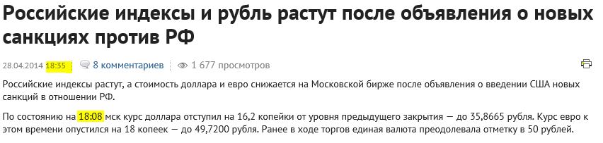 Я что должна вам поминутно расписывать ход торгов на бирже??? По поводу вчерашних торгов. Ожидались более суровые санкции. Ожидался обвал индексов. Не случилось. DVR, сильно расстроились? Ну мож сегодня обвалятся вам на радость)))......хотя вряд ли.... Зы. С днем рождения ! ---------- Сообщение добавлено 29.04.2014 05:57 ---------- DVR, нате вам еще из того же источника " Фондовые торги в РФ завершились в «зеленой зоне» 28.04.2014 18:50 305 просмотров Торги на Московской бирже в понедельник завершились в «зеленой зоне». Индекс ММВБ зафиксирован на отметке 1 299,13 пункта (плюс 1,49% к предыдущему закрытию), индекс РТС — на уровне 1 139,29 (плюс 1,78%). Наибольший рост продемонстрировали акции Сбербанка — 5,16%. Бумаги «Газпрома» выросли на 2,23%, «ЛУКОЙЛа» — на 1,89%. Акции Московской биржи подешевели на 0,04%. «Российский индекс ММВБ подобрался к 1 300 пунктам. Таким способом инвесторы отыгрывают более мягкие, чем ожидалось, санкции Запада в отношении России. США объявили о введении дополнительных санкций против 7 частных лиц и 17 российских компаний, а также о запрете экспорта в Россию высокотехнологичных товаров, которые могут способствовать увеличению военной мощи РФ. Совет ЕС готовится принять лишь индивидуальные санкции, которые будут предусматривать главным образом расширение черного списка высокопоставленных россиян», — говорит аналитик банка «Российский Капитал» Анастасия Соснова. " Опровергайте!)