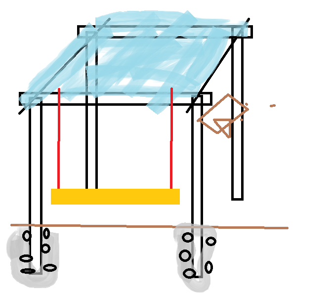 что-типа планирую делать. геотекстиль+щебень, далее буром ямки на 70см, профильная труба из 3-го решающего, забить камешками, плюхнуть жидкого бетона, покрыть битумной мастикой (вместо краски). Вместо сварки болтовые соединения. Подвес на цепях из мастеринструмента (копейки), лавки самомоу сделать (в ОБИ по 269 двухметровые толстенные доски). Дольше везти материал, чем делать. Абсолютно всё можно купить прямо в пойме. p\s сказать подружкам, что дизайн разработан французом Пьером Шипсером, а воплотили задумку итальянские мастера из пригорода Рима (для фарсу можно куйню какую-нибудь на импортном напечатать и в рамку вставить - сертификат подлинности). Так вся итальянская мебель в бутиках делаеца