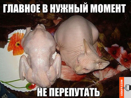 brend1999, верю, почему нет))) Мои сравнения на фоне кошек независимых и самодостаточных, самих по себе. У сфинксов, кстати, к незнакомым людям дистанции нет - любопытные и дружелюбные. Моя внимание оч.любит, когда перевозила её, надо было в кафе заехать - так она даже там радостная, головёнкой крутит, с людьми общается. Пишут, что они прекрасно ладят с кошками и собаками другими. У моей, конечно, проблема в этом - она трусишка и нападает первой. Звери к ней с дружбой, а она до последнего шипит. Ну или потому, что её уже бросали, боится конкуренции. ---------- Сообщение добавлено 16.04.2014 18:23 ---------- Свинёнок 2 суток спокойно самостоятельно живёт, если дольше - прошу позаботиться о ней. А так, два лотка, воды и еды хватает, остаётся ещё. ---------- Сообщение добавлено 16.04.2014 18:25 ---------- Кошку ругаю курицей))) Дразню: у моей кошки куриные ножки. На фотожабу было бы совсем понятно, если сверху и немного сзади сфотать, когда кот сидит - ну точно курица! Только с крысиным хвостиком))) ---------- Сообщение добавлено 16.04.2014 18:26 ---------- Это трансформер - и курица, и кошка, и собачка, и обезьянка, и крысик, и живот поросячий)))