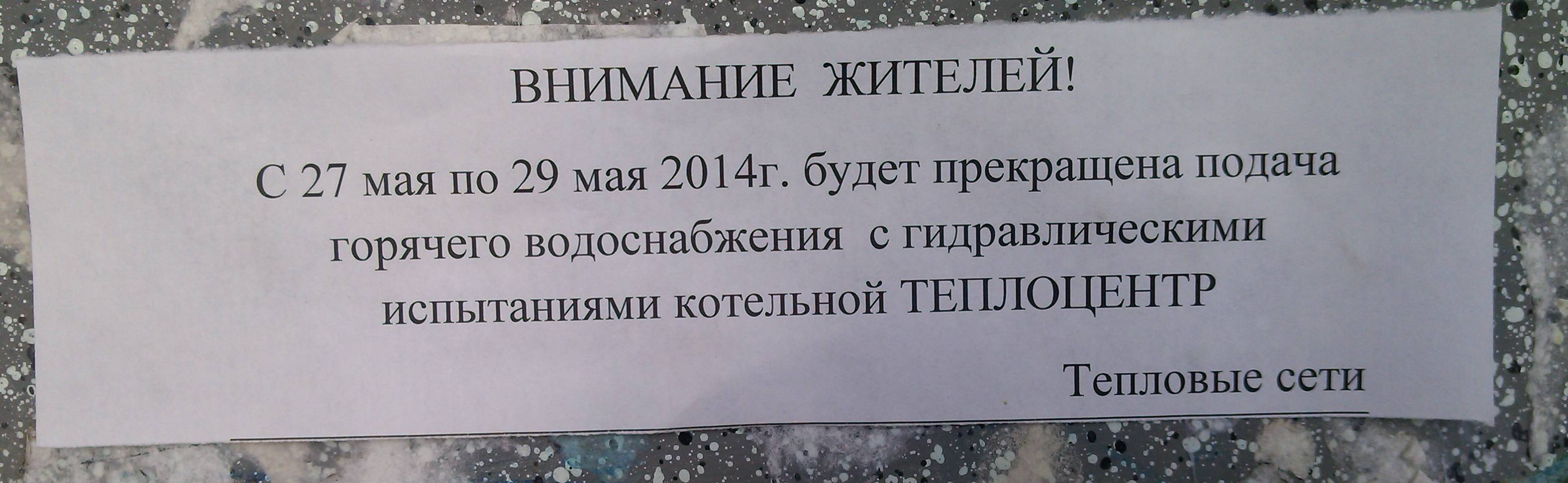 Второй раз за последние две недели отключили с утра горячую воду и к обеду повесили на подъезд объявление: "ВНИМАНИЕ ЖИТЕЛЕЙ! С 27 мая по 29 мая 2014г. будет прекращена подача горячего водоснабжения с гидравлическими испытаниями котельной ТЕПЛОЦЕНТР Тепловые сети" Спешили видно сильно, раз слова пропустили Что такое они испытывают?
