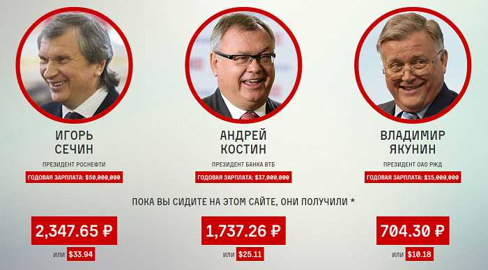 Пятничный сайт, который вам понравится https://navalny.com/p/4099/ Развлекательный сайт от ФБК на популярную тему. https://money.fbk.info/ Просто зайдите, оставьте открытым и занимайтесь своими делами. Время от времени поглядывайте, чтобы оценить тяжкую долю глав госкомпаний в кризисное для страны время.
