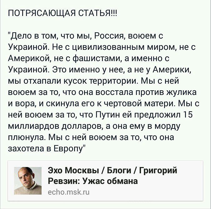 а я на фото такого рода уже не раз говорил, что это не повод повторять это в ДНР так что там с администрации обстрелянной из самолета? кто же это был? и какая необходимость была стрелять туда? ты лучше на мой вопрос ответь, а то съезжаешь постоянно ---------- Сообщение добавлено 06.06.2014 10:47 ---------- а мне так не кажется ---------- Сообщение добавлено 06.06.2014 10:48 ---------- а может надо было встретиться с людьми и решить все вопросы? выслушать мнения?