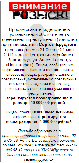 Суд признал подозреваемых в убийстве волгоградского бизнесмена Сергея Брудного Алиетдина Махмудова, Абугали Темерханова и Хасу Баталова виновными по всем обвинениям. Каждый получил по заслугам: Махмудову присудили 17,5 лет лишения свободы, Баталов и Темерханов приговорены к 17 и 16 годам. Все направятся в колонию строгого режима. Следствие и суд установили, что 21 мая 2014 года около 9 часов вечера, Баталов подъехал к кафе на Центральной набережной, где коммерсант Сергей Брудный отдыхал со своим приятелем гендиректором Центрального рынка Евгением Ремизовым, и расстрелял обоих. Брудный скончался в больнице. Ремизов, к счастью, остался жив. Заказчики убийства - Махмудов и Геберт - пообещали киллеру миллион рублей. Мотивом к расправе над потерпевшим стал передел сфер влияния в бизнесе. Водителю убийцы, судили отдельно, так как он единственный, кто признал свою вину. Ему дали 12 лет «строгача». Основного заказчика преступления – Геберта – до сих пор не нашли. Он находится в федеральном розыске. http://www.kp.ru/online/news/2103439/
