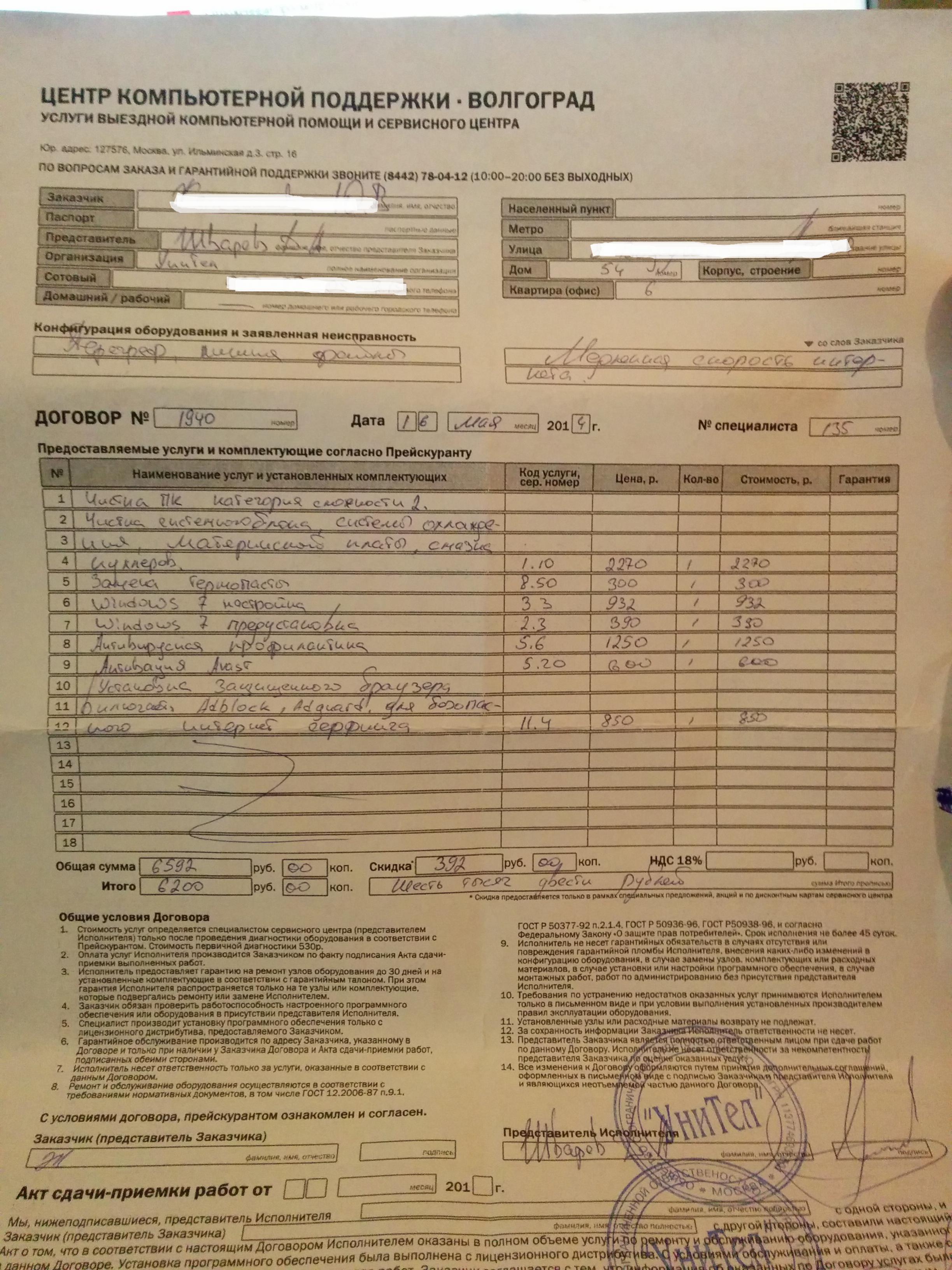 Обратились ко мне вчера знакомые с проблемой - низкая скорость интернета на одном из компьютеров дома. Но дело не в том, как я решал эту проблему, а в том, что до меня они обращались в некую контору по объявлению, представитель которой провёл целый день, но ничего не исправил, но при этом ВНИМАНИЕ взял с этой несчастной женщины 6500 рублей. Я потерял дар речи, когда мне показали акт выполненных работ. Это просто дно, я думал такое бывает только в интернет-байках. Причём эта гнида реально только хуже сделала. Он установил винду 7ку на древний пентиум4 с 1 гигом оперативы, не активировал её, криво поставил кулер, так что он болтался на двух клипсах, из-за чего температура даже в простое 90 градусов была, плюс (см скриншот) сделал ещё много чего, чего вообще не нужно было делать и оно не имело отношения к проблеме. В итоге помимо медленного интернета прибавились ещё и дикие тормоза самой системы даже после того, как я закрепил кулер. Предлагаю распространить везде, чтобы это этим деятелям пусто стало