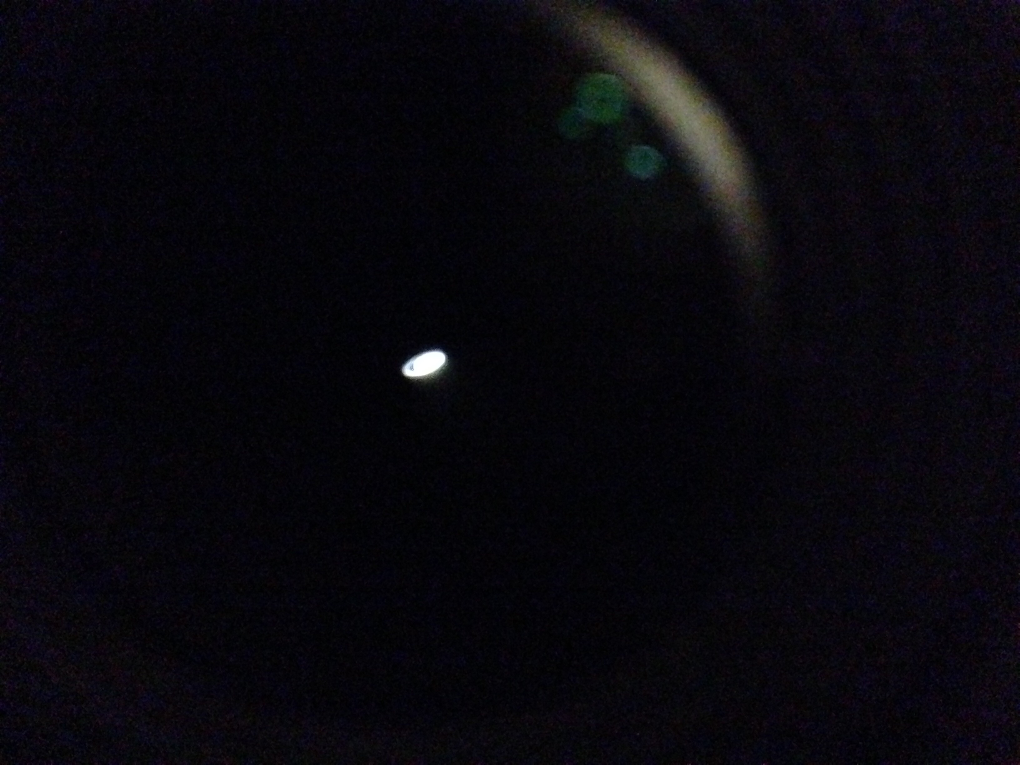 Ура!!!!! Я сегодня в первый раз увидел Сатурн!!! Наблюдал с 4 до 4:30. Впечатления примерно как от наблюдения Юпитера. На диске Сатурна видно 1 полосу аналогично Юпитеру, и, конечно же, кольца. Правда щель Кассини видно на уровне интуиции. Хатя диаметр телескопа должен позволять видеть четко эту щель в кольцах. Периодически изображение плывет, скорее всего из-за потоков воздуха. Попытался приложить камеру телефона к окуляру и сделать фото - получилась пародия на Сатурн))) ну в общем-то другого ожидать не приходится фоткая небесные тела на телефон. Но тем не менее, фотку выкладываю