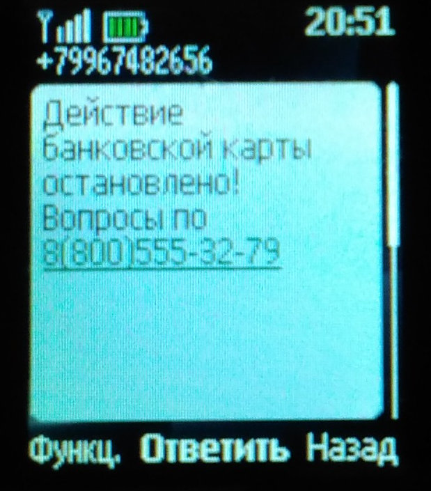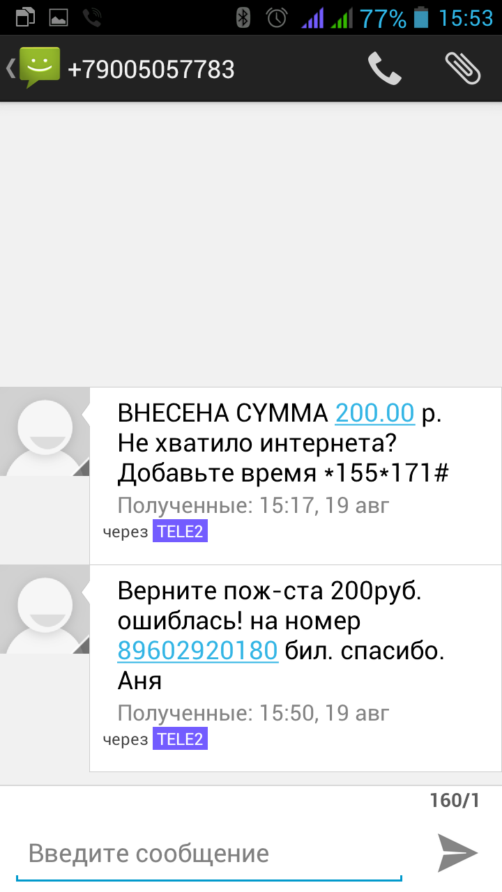 блин, вот из за таких разводил мне деньги не вернули...Хотя не особо рассчитывала. Но я с карты сбера зачислила с просони дочери 100р на телефон, и одну цифру перепутала (полусонная). Она в лагере была летом... Когда дшло до меня, написала на этот номер смс, назвала какое имя высветилось в оповещении с номера 900 (обычно приходит текст, типа Имя Отчество Ф. перевела на ваш номер 100р), но мне так и не перечислили... Позже написала: Пользуйтесь на здоровье.... Так что. если кто то читающий эту тему, в июле прошлого года получал такую смс от Анны Денисовны О., то знайте - это не развод