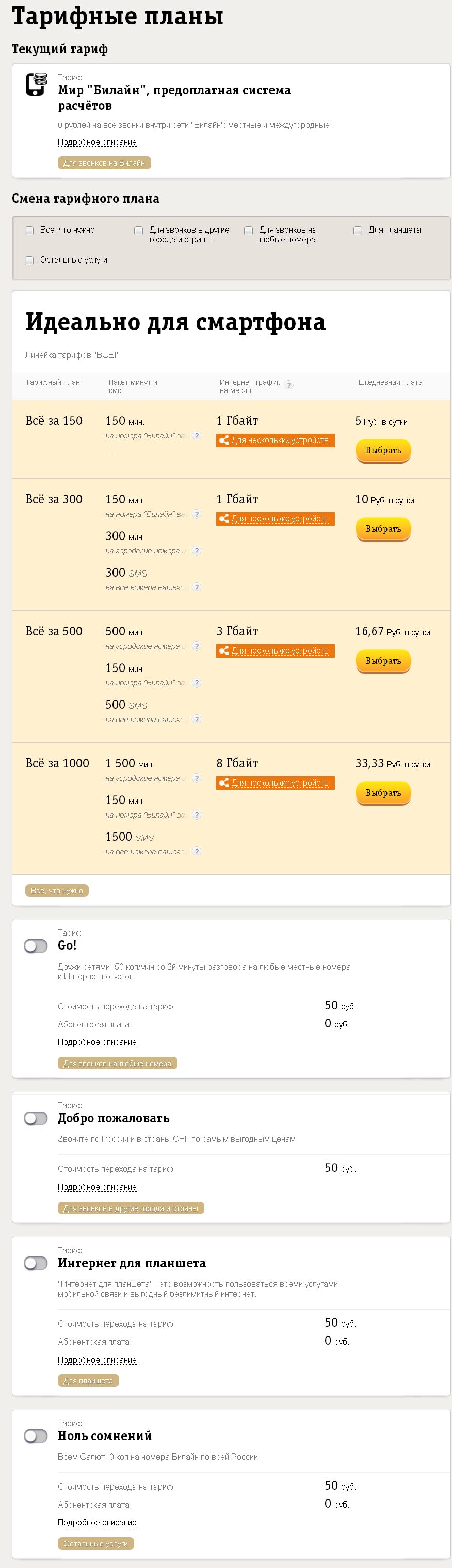Неожиданно обнаружил отмену тарифа Легкий интернет или как его там для модема. Недоволен. Меня вполне устраивало 245 руб, платить 400 за хайвей 30 гб принципиально не буду, не нужны они мне, коекак обнаружил на сайте вроде другие тарифы, даже вроде умудрился отправить заявку на подключение, 8 гб чтоли за 260 руб, и даже пришло подтвердение подключения - но деньги не списаны... Через ЛК вообще предлагается для модема только два тарифа, помегабайтный и упомянутый уже 30гб хайвей, на сайте других тарифов простым путем найти невозможно, я до сих пор не пойму как я их вообще увидел, потому что вроде бы один и тото же алгоритм навигации(я сам уже запутался...) приводит к совершенно разным результатам. ЗЫ: Еще достала табличка с предложением оценить сайт, на самом сайте сделать это не удалось, так что напишу здесь, сайт убогейший, верх идиодитизма, когда я захожу по адресу волгоград.билайн.ру, усомнение, а ваш регион точно волгоград?Нет, ханты-мансийск...