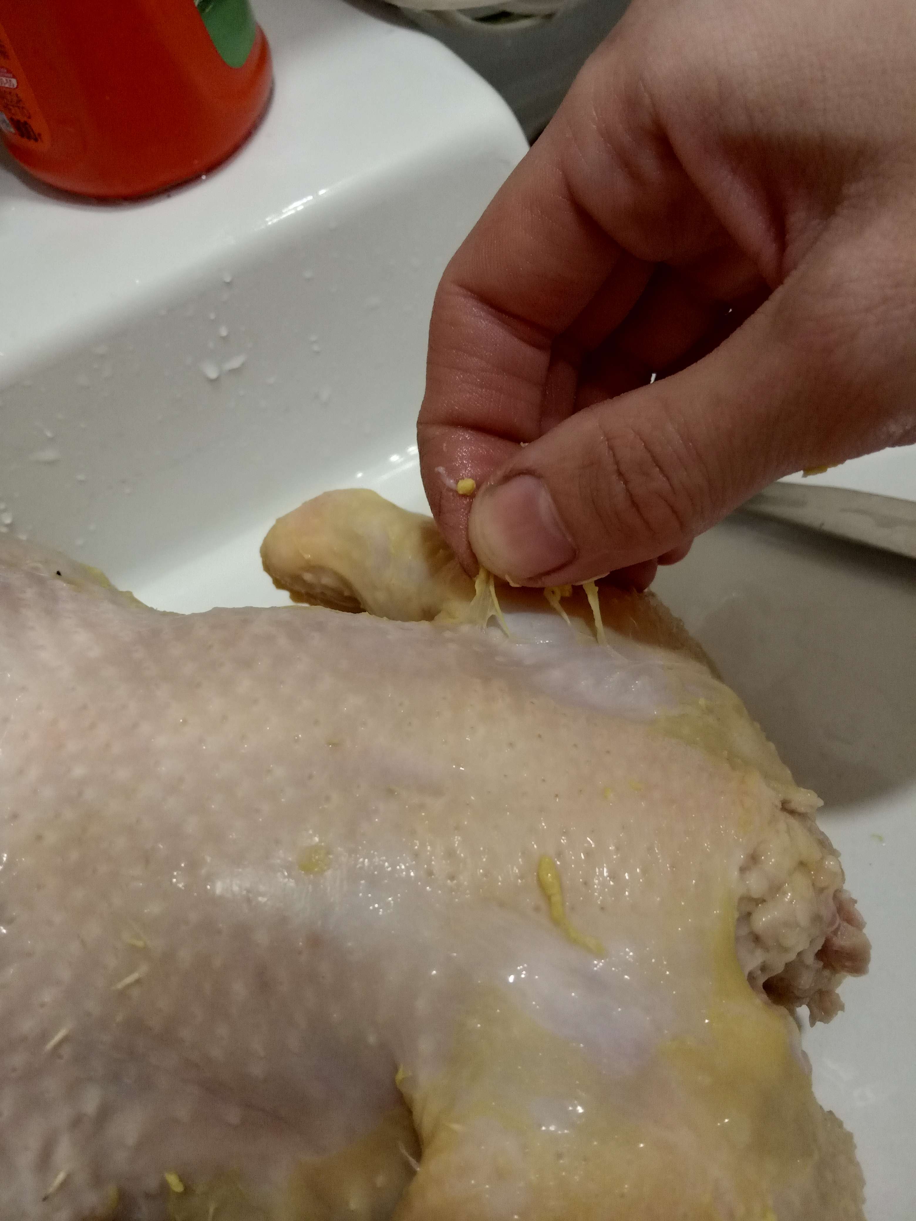 Кожу снять и все. Если не жарить целиком тушку, то кожа и не нужна. Тушу без кожи вымочить в воде. Вообще на таких курах всегда желательно читать состав. Если там что-то нашпиговано, то пишут. Особенно это касается всяких «цыплят для жарки». На обычной курице просто «тушка цыплёнка-бройлера».