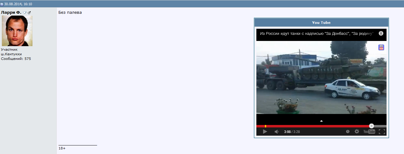 А вот это видео. Не? http://www.forum-volgograd.ru/showpost.php?p=5184028&postcount=246 Ростовская область, г.Каменск-Шахтинск. Везут военную технику с надписью "За Донбасс". ---------- Сообщение добавлено 31.08.2014 11:37 ---------- Хотя я подозреваю, что сейчас мне ответят, что на машинах тоже пишут "На Берлин", но это ничего же не доказывает))