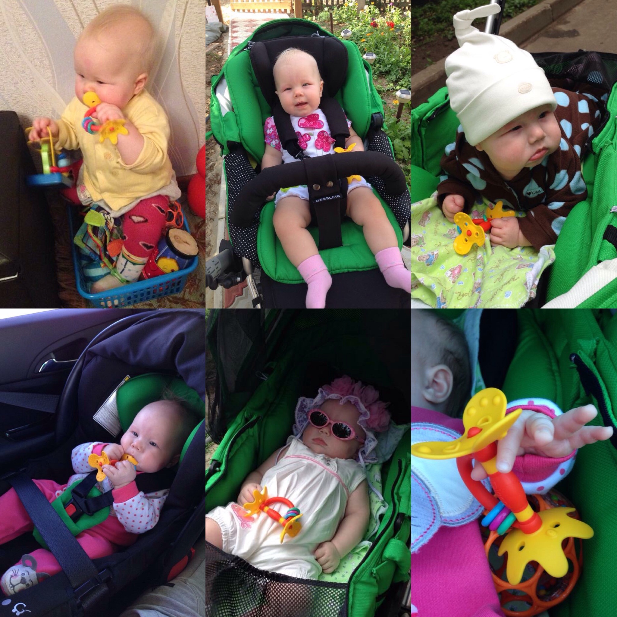 Вот, и гуляли и играли и ездили с этим прорезывателем, он резиновый и на каждом лепестке разные выпуклые рисунки. Тоже махали калгелем, но не часто. У Даши зубы выросли как-то не заметно, вот ждём четыре последних, страшно)