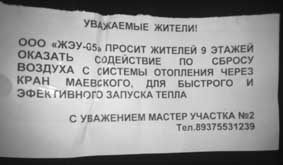 academic, ЕМНП не слышал я лично шума в батареях в эти сроки (не показатель, т.к. могло быть в мое отсутствие), но, по факту на сегодня, промывки и спуска воздуха хватает на несколько часов. И это кагбэ слегка бесит... З.Ы. Самое гнусное, складывается впечатление, что такое дерьмо в трубах будет всю зиму, а ЖК постарается переложить почетную обязанность стравливания воздуха круглосуточно, каждые несколько часов, на плечи жильцов верхних этажей. Уже и объяву на подъезд про это вывесили типа просим оказать содействие.