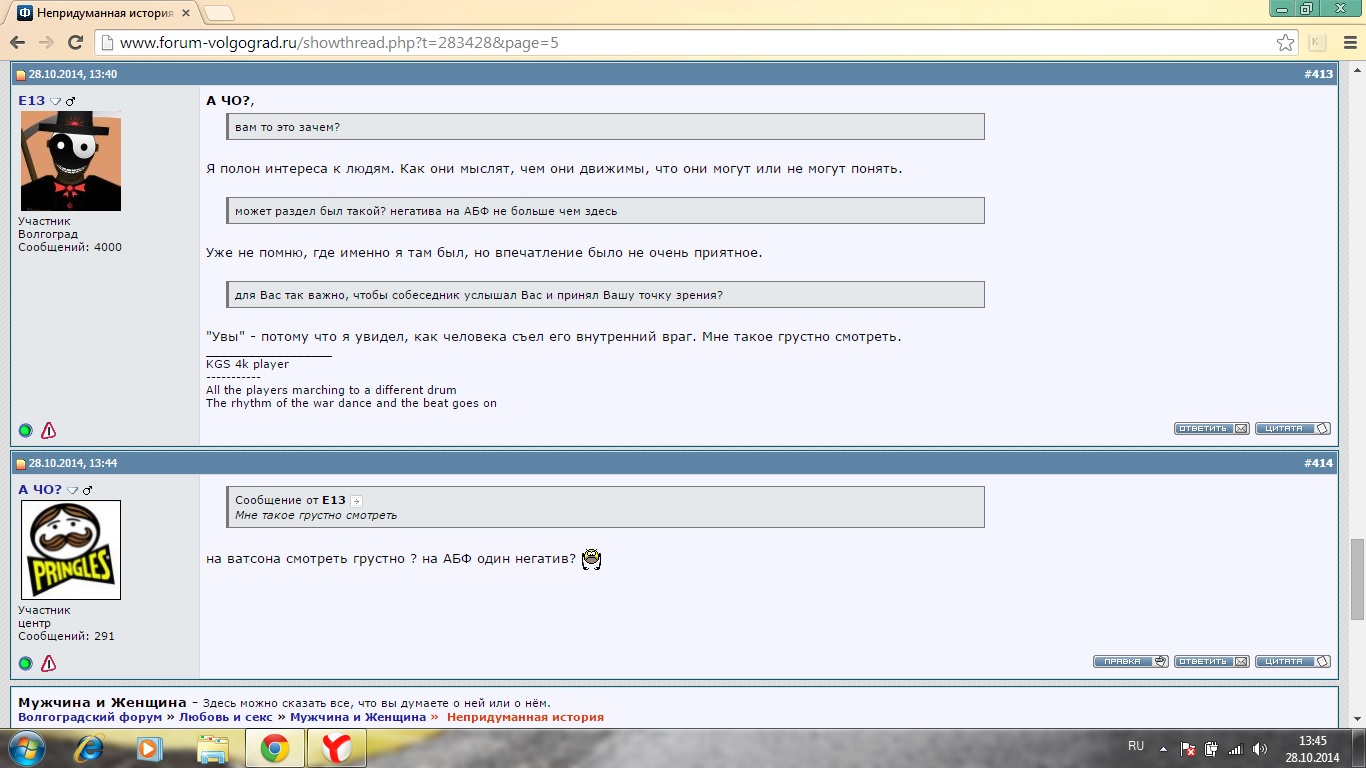 Как совершенно верно заметил Луговский - человек считается разумным до тех пор, пока он сам не доказал обратного Поэтому в полемику вступать правильно. Тут я полностью понимаю Е13. Главное - выйти из неё после того, как оппонент всё сам про себя доказал И тут Е13 тоже поступил правильно.