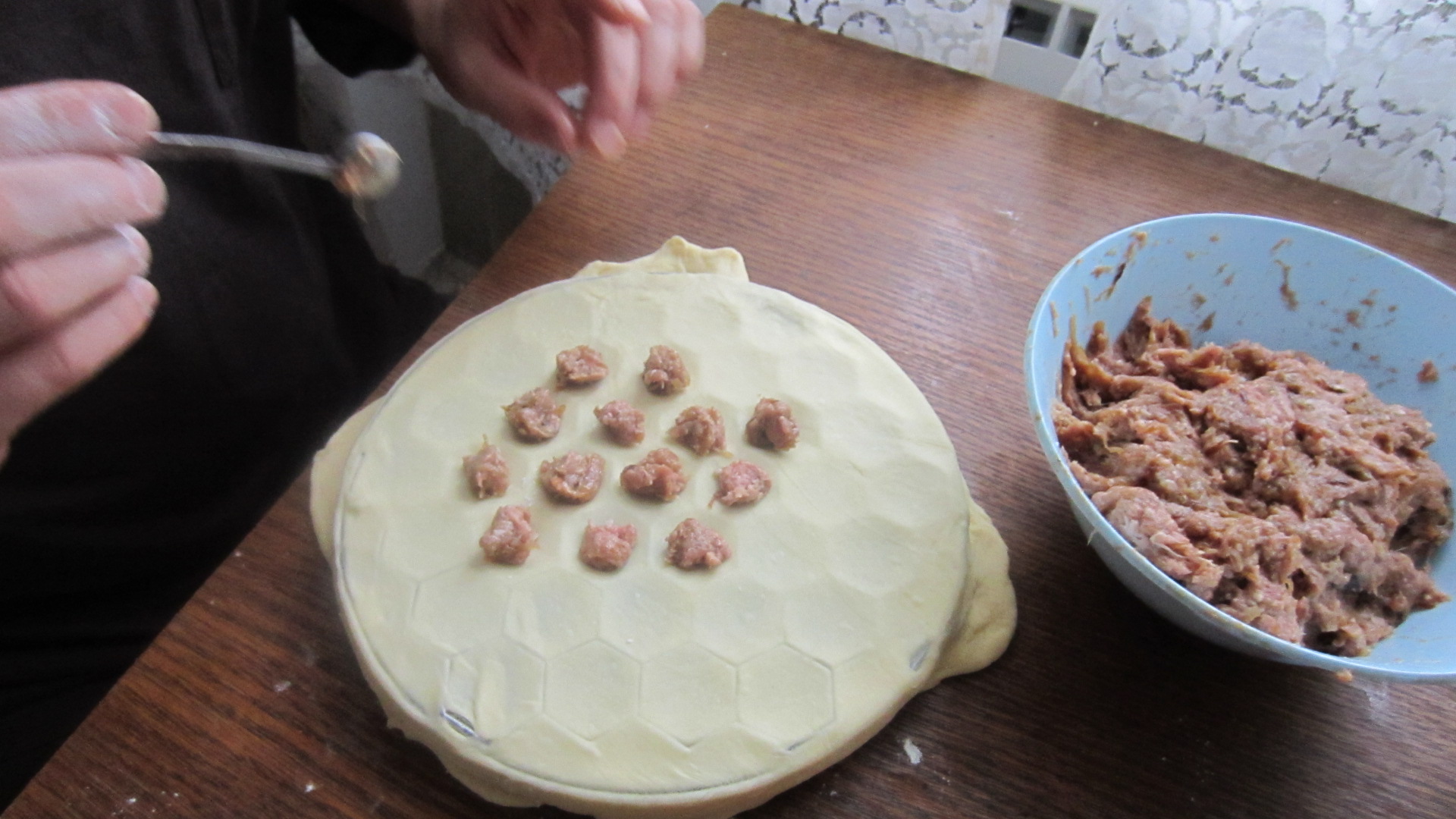 В очередной раз восхищаюсь преклоняюсь и ... ---------- Сообщение добавлено 03.11.2014 16:38 ---------- Тесто на пельмени делаю просто, мука вода соль яйцо. тесто крутое насколько можно. Так как делаю руками ни одна бытовая хлебопечка не может. А то что делает хлебопечка разваривается ( жидкое оно . Мясорубку не люблю. двумя топориками зело быстрее и мыть меньше. ---------- Сообщение добавлено 03.11.2014 16:47 ---------- а зачем? Вариантов лепки пельменей несколько. первый из листа стопкой варезаем кружки. внутрь начинку и сложив пополам защипываем, два ушка соединяем вместе получается пельмень классический. Если времени мало а пельменей надо много, тогда полоску теста выкладываем на стол, на нее укладываем фарш порциями, и накрыв горки фарша этим же листом( как бы переворачивая страницу книги),стопкой варезаем этакие полумесяцы, и фарш остается внутри, остается только слепить два хвостика. А когда совсем нет времени делаю пельменный рулет На лист теса тонким слоем кладу мясо( или любую другую начинку, я люблю сырую картошку с красным перцем и сливочным маслом и закатываю в рулет. Края защипываю чтобы все было герметично . Такой рулет на ярус мантикаскан, и через час за уши не оттащищь.