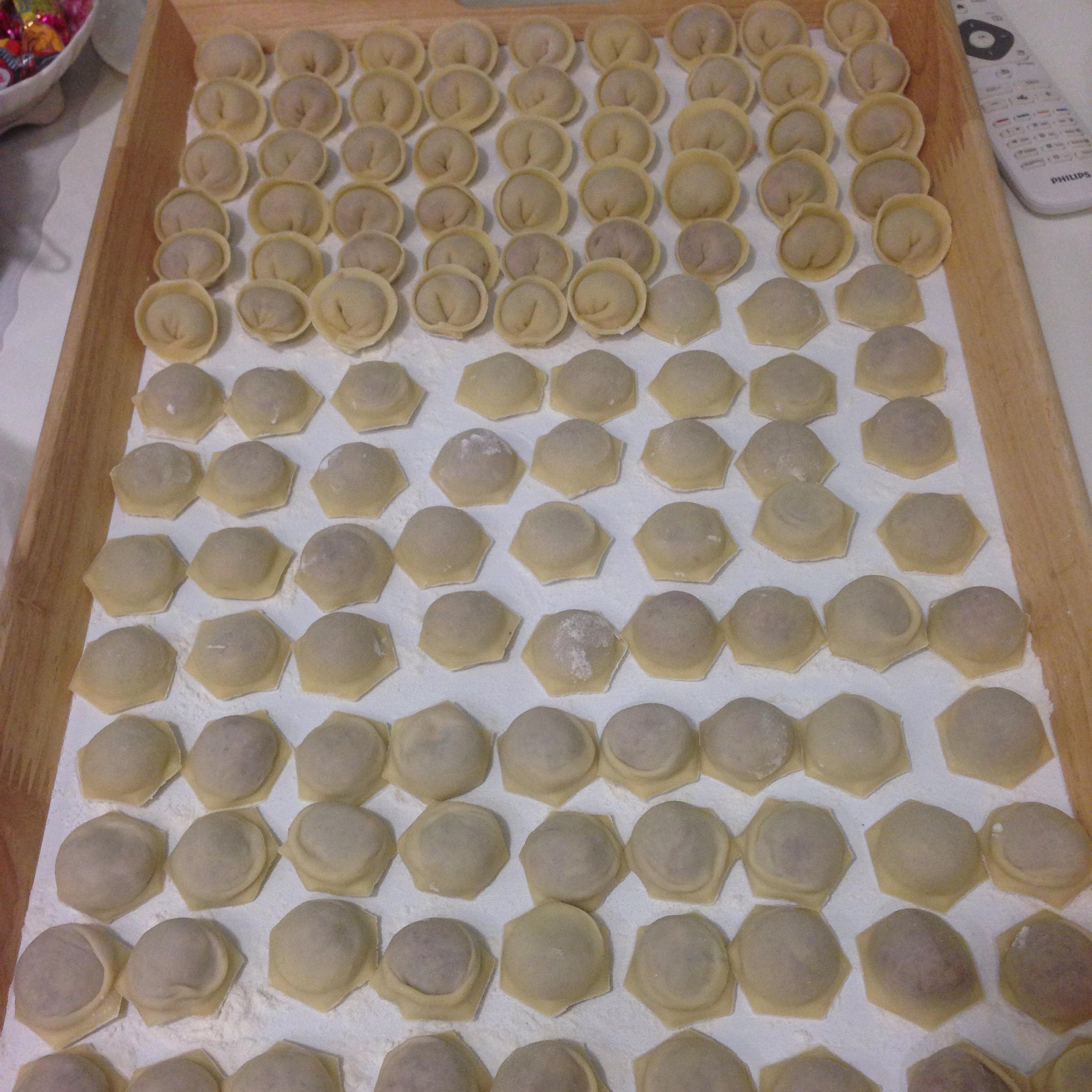 Сегодня к новогодним дням лепили. Запряг всех. Кабанятина, говядина, свиное сало, лук, сушеный базилик, чуток растертой зиры, соль. Штук двести с лишним. завтра закончим. Фарша еще столько же.