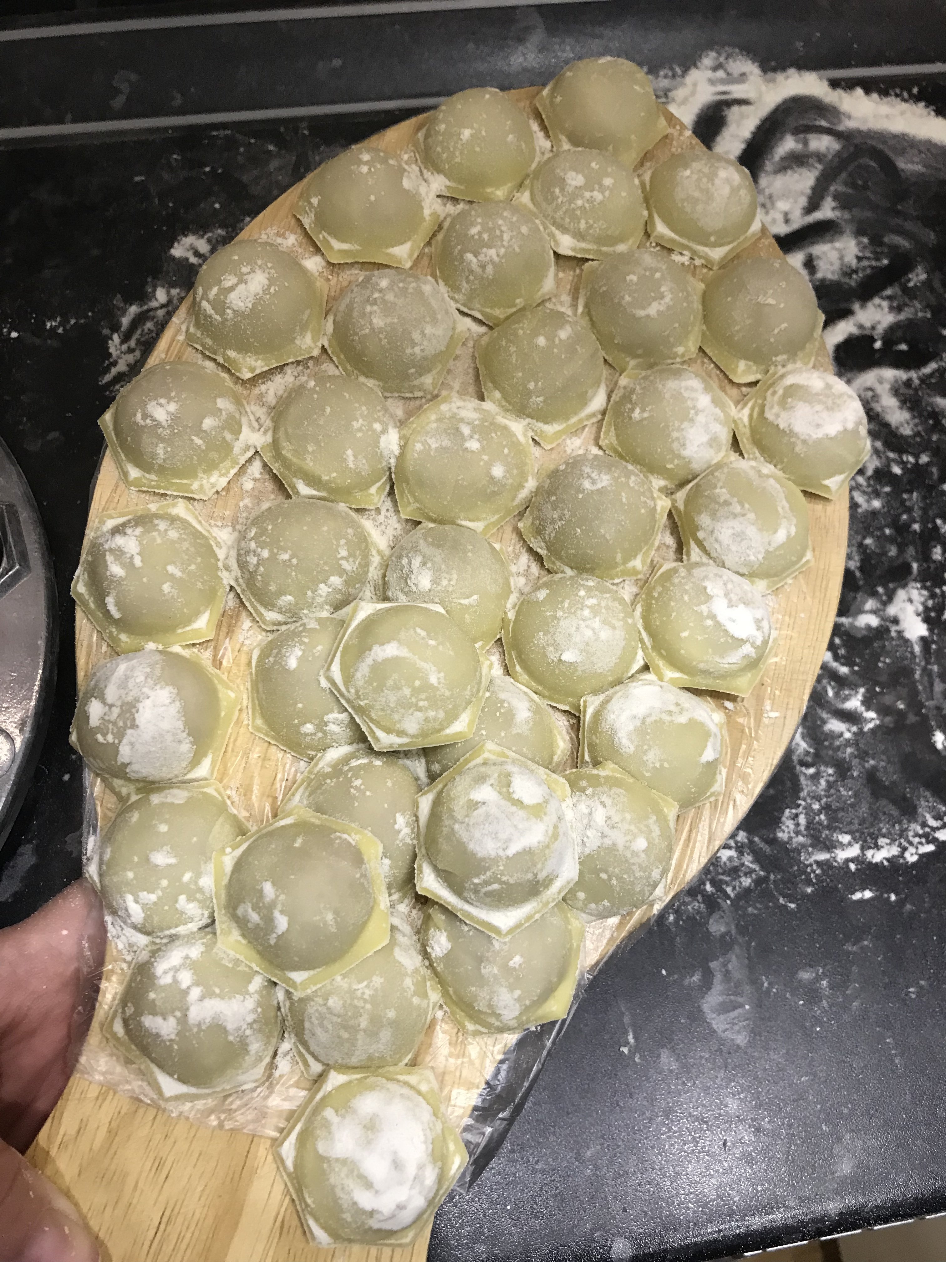 Пельмени вчера лепила. Тесто на молоке, только в это раз прям мягкое получилось. Фарш: свинина+говядина, соль, перец, кинза. Хоть кинзу я люблю, но пельмени с базиликом больше мне понравились. Мой личный рекорд 259 штук на форме, это 7 форм.