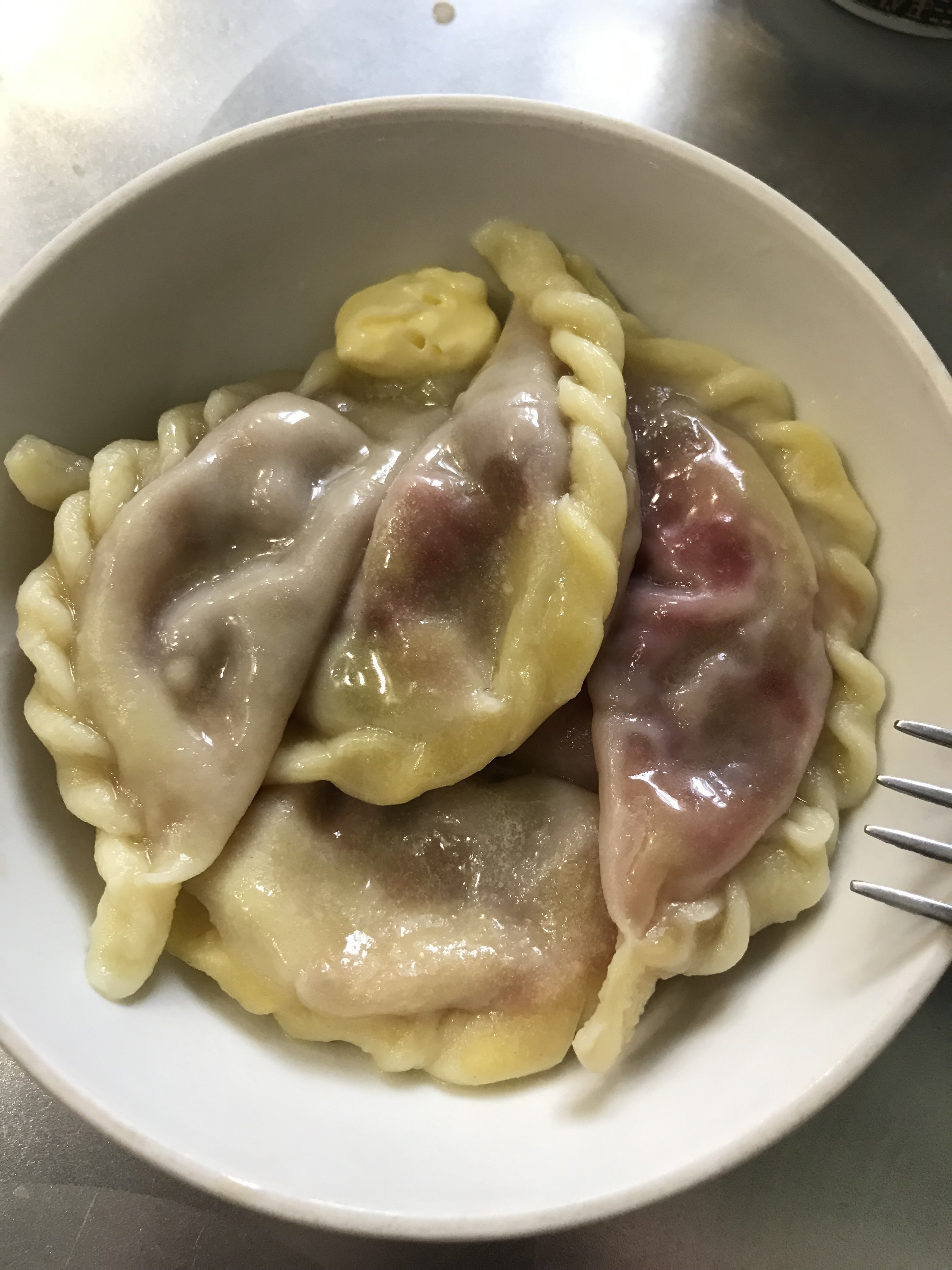 Пельмени окт.2019 Тесто Мука - 500 гр, у меня макфа. Яйцо - 1 шт, у меня домашнее Растительное масло - 1 ст.л., оливковое брала Соль - 1 ч.л. Молоко - 250 мл. Муку просеиваю в миску, добавляю яйцо, перемешиваю, добавляю масло и соль, перемешиваю, вливаю молоко и замешиваю тесто. Выкладываю тесто на стол и хорошо его вымешиваю, до однородности и мягкости. Иногда добавляю ещё молоко прям по 5-10 мл при необходимости. Кладу тесто в пакет и в миску, оставляю на столе в покое минут на 40. Начинка Свинина - 500 гр Говядина/телятина - 500 гр Лук репчатый - 1 шт Соль, чёрный молотый перец, базилик сушенный - по вкусу Мясо, лук перекручиваю, добавляю по вкусу специи, хорошо перемешиваю. Леплю в форме, тк в одного руками долго и нудно. Но ручная лепка, всё же вкуснее)) Я выросла на пельменях чисто из свинины, сейчас мне так немного жирно и я делаю с добавлением говядины/телятины. Сегодня у меня пельмени из мяса индейки. Сделала 3 формы, это 111шт. При подаче люблю добавить сливочное масло и конечно сметану) Иногда хочется в уксус (разбавленный с водой) макать, это уже тогда без масла и сметаны. Из этого же теста сделала немного вареников с малиной. А из остатков теста всегда шинкую лапшу. Лапша тонкая) В идеале варим бульон из домашней курицы, заправляем лапшой домашней и сразу едим.