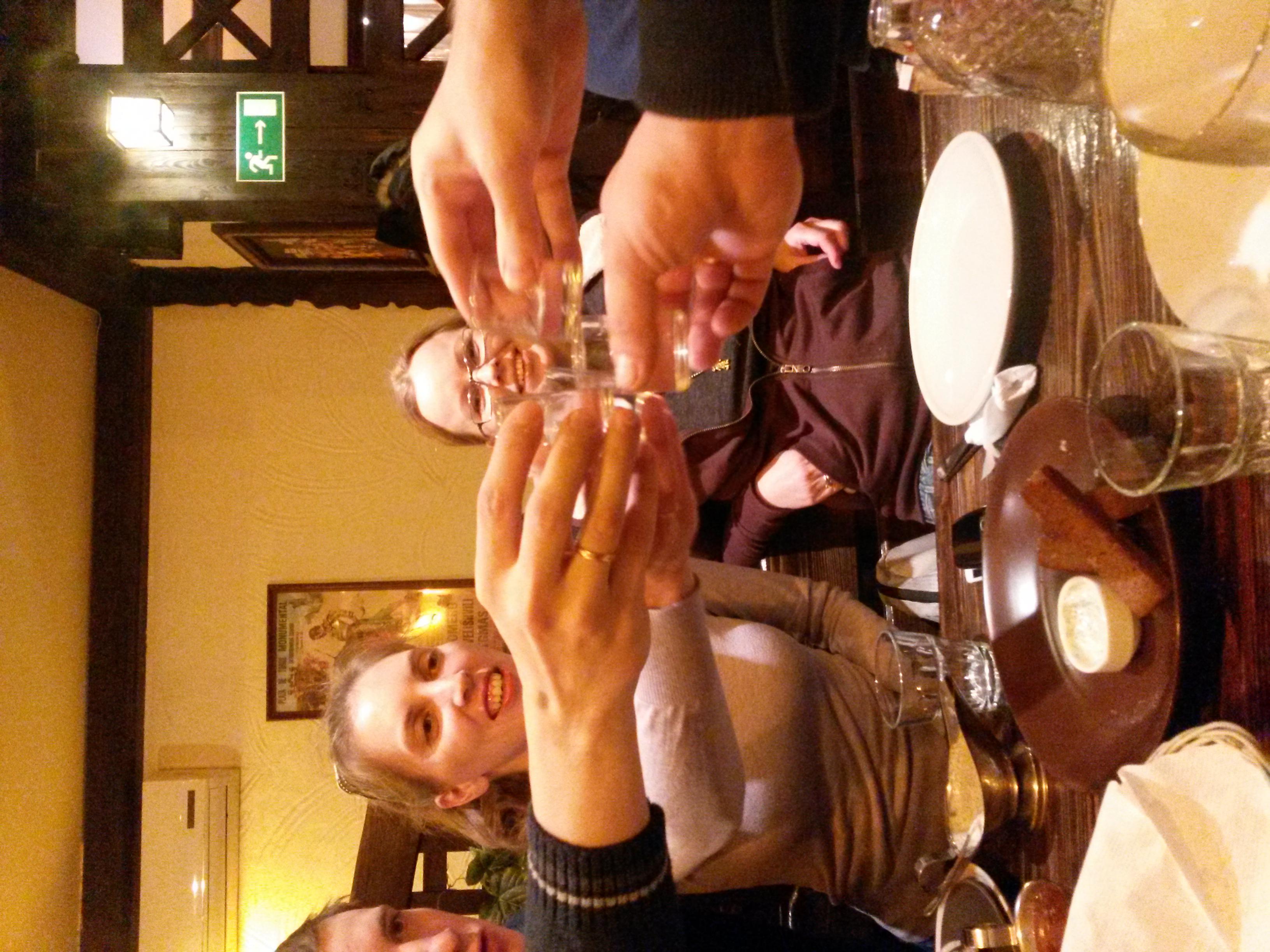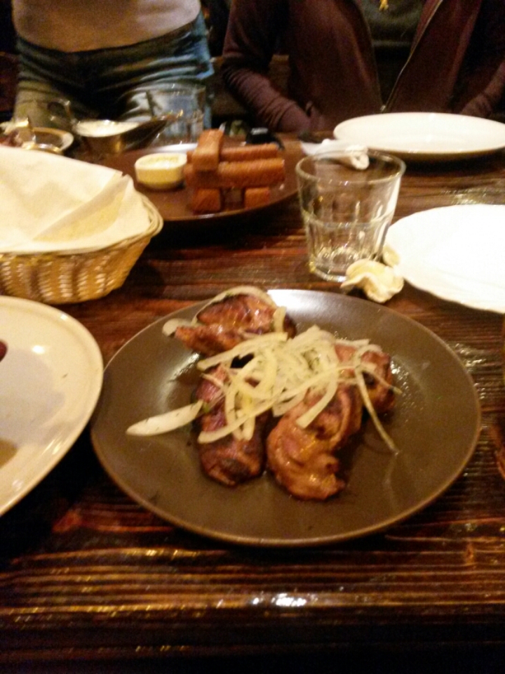 Вообщем нормально посидели, хинкалями обожрался, очень вкусные но немного островатые но это по кайфу, Столик заказывал на 10 человек ,как раз пришли 9 человек, собирались многие но пришли не все,чачи опились ,спиртное к них очень дешевое, начиная от водки и заканчивая коньяками.Официантка была очень приятная девушка, даже Маришке вроде понравилось грузинское вино... Народу было очень много все столики забиты, приятное общество девушек в нашей компании согревало душу, тока шиля свинтила таща неоская домой.