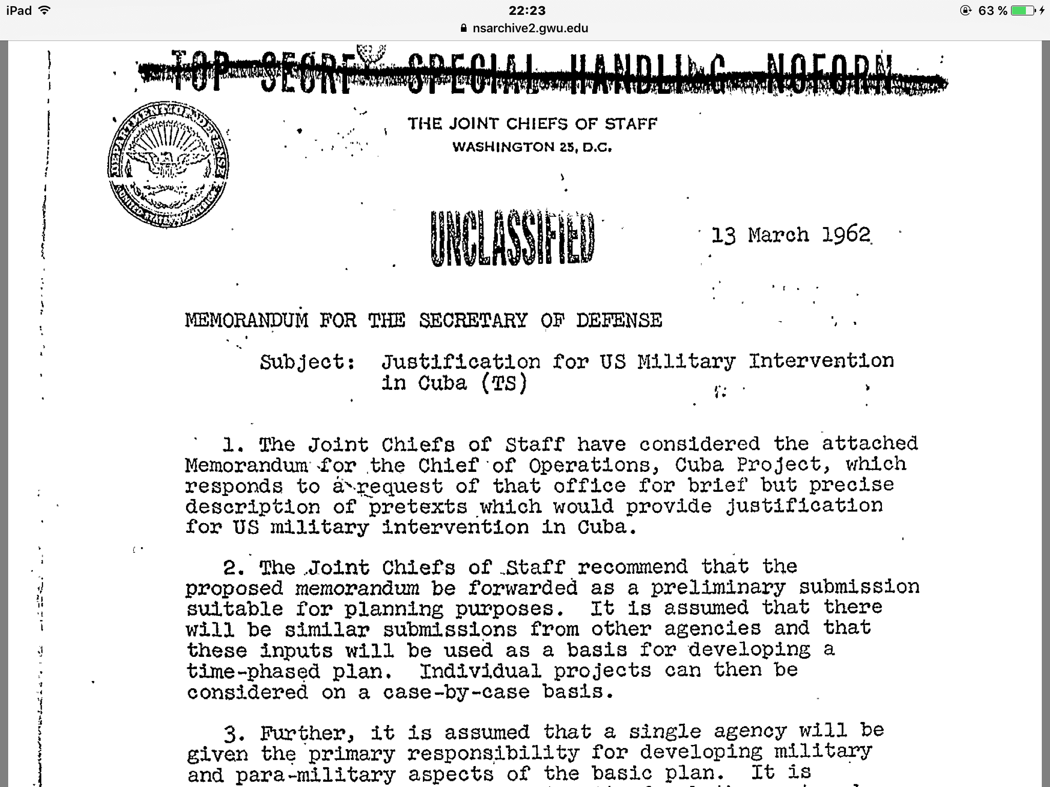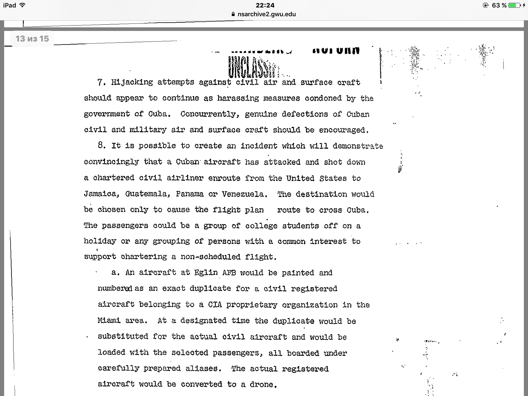 Тут вот интересный документ отыскался между делом. https://nsarchive2.gwu.edu//news/20010430/doc1.pdf Рассекреченый, прямо на сайте Университета Джорджа Вашингтона, того самого, что в округе Колумбия, город Вашингтон. Некий меморандум Комитета начальников штабов США. Документ небольшой, всего 15 страниц в пдф. Там много всяких предложений по насущным мероприятиям, но цитатку я приведу, касающуюся как раз гражданских самолетов. (Ну и еще, что там кривой планшетный копипаст накопипастит) Источник и полный текст Иран и обоснование военной интервенции на Кубу (balda74) .
