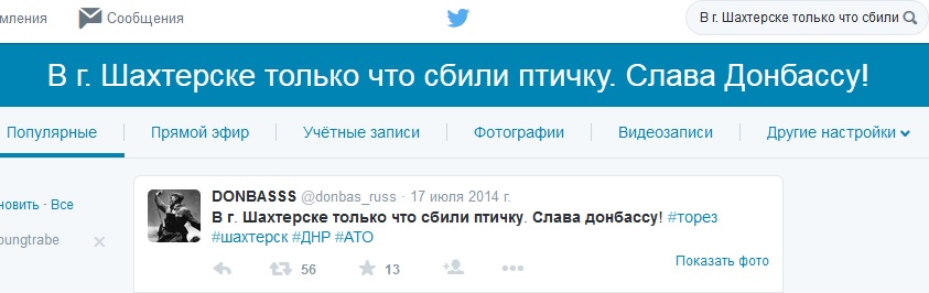 Ютта, я вот только что в твиттере вбил в поиск некую фразу (ее видно на скриншоте) и получил результат (любой из вас может перепроверить что это не фотошоп, тоже поискав по твиттеру): вопрос: чо за фигня? ополченцы радуются успеху укропских ракетчиков?