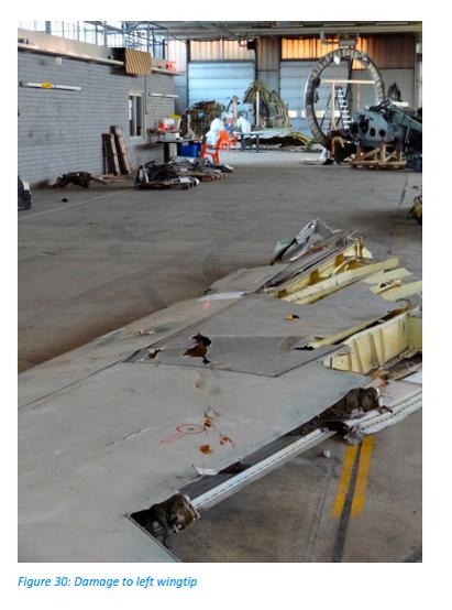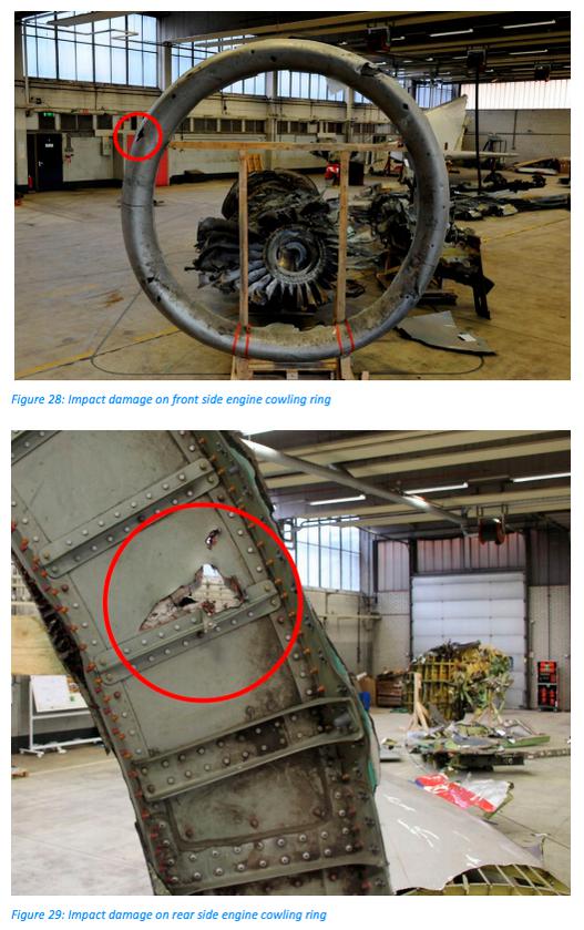 А казалось бы, открой отчет, почитай.. Стр 25, п. 2.11 приложения X "Наблюдаемые пробития показывают основное направление движения элементов, с источником в зоне левее и выше кокпита. Размер повреждений, вызванных объектами, которые пробили одновременно и переднюю и заднюю части кольца, значительно крупнее, чем повреждения, найденные на обломках кокпита. Размер всех пробитий спереди кольца был измерен и оказался в диапазоне от 1 до 200 мм. Только 5 из 47 пробитий были в том же диапазоне 6-14мм, как те, что найдены на кокпите. Ни один из 5 вышеуказанных объектов не пробил заднюю стенку кольца." Кто не понял, то БЧ находится не на носу ракеты, а смещена немного назад. И когда БЧ детонирует, поражающие элементы летят кольцом в рамках деформированного нормального распределения (т.е. не ровным кольцом, а сектором, и чем ближе к краям сектора тем меньше элементов, при этом из-за неидеальности взрыва отдельные единичные элементы полетят куда приспичит), назад летят части двигателя ракеты, а вперед летят части обтекателя ракеты. Вот эти части и зашли в левый двигатель.